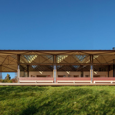 Conceived as a delicate, steel-framed pavilion that floats above a meadow of wild grasses, the simple house includes a long living and dining hall framed by three smaller spaces: a kitchen, a bedroom, and a bathroom.