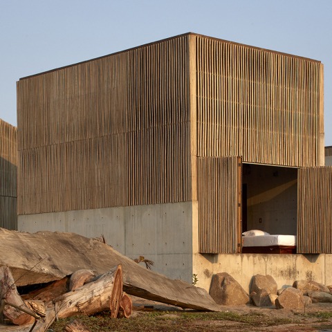 The palm bone skin, a technique traditionally used in informal beach huts, was adapted to provide a contemporary interpretation of vernacular construction techniques. Its usage brings transparency, permeability allowing cross ventilation and views to the outside without the need for windows.
