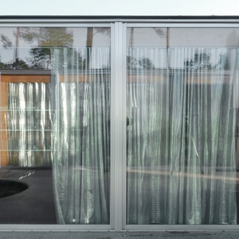 The house is built with a timber frame and posts and beams on a polished concrete slab. The roof is a membrane that meets the development's flat roof requirement. The anodized aluminum window frames open only onto the courtyard.