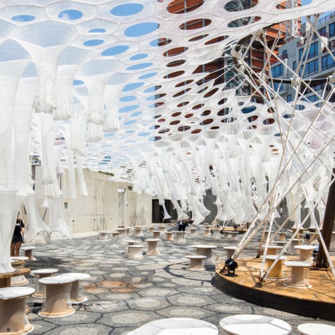 Beneath the canopy, 100 robotically woven recycled spool stools and a motion-detecting misting system will allow visitors to relax and cool off out of the heat of the hot New York summer.