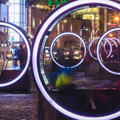 This winter the Quartier des Spectacles Partnership invites Montrealers and visitors to discover Loop, an original installation on the Place des Festivals, on the Quartier des Spectacles. The work, which will be presented from December 8 to January 29, consists of 13 giant zoetropes – an optical toy that was a forerunner of animated film. When a zoetrope is activated, images are shown in rapid succession, creating the illusion of motion.