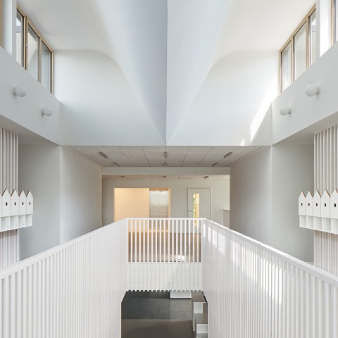 schleicher.ragaller configures the project based on wide and bright access areas that favor orientation and the perception of clarity from the interior that leads to a distribution area from which the different rooms and common areas emerge, in addition to the central staircase with a single flight that functions as a large central skylight and connecting element that gives access to the nearby classrooms.
