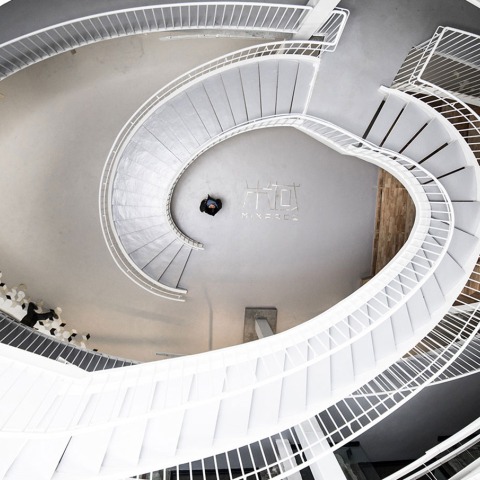 The building in Mandela project has a brick-concrete structured warehouse and was renovated in the 1980s. In 2014, it was again renovated and reinforced with additional steel structures. The original concrete walls and its patched texture have been well preserved and covered with clear glass, which created an effect of two textures collage. The staircase, as the media for emotional and functional interactions, becomes the most important element in this whole space.