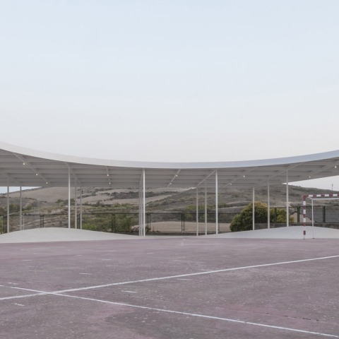 An element is proposed as a light covering, with a perimeter that fits exactly to the South limits of the plot, which constitutes the urban edge of Mendigorria, and to the limits of the regulated playgrounds, separating itself from the constructed building; leaving free the soccer and basketball fields, which distance the existing building from the new construction, obtaining a void and a tension between the only two elements built on the plot, creating a new urban landscape that frames the natural landscape. It appropriates the marginal spaces of the schoolyard, putting them in value, and invites introspection and contemplation; opening the possibility of other types of games and activities besides sports, the playground as a coeducational space.