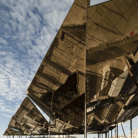 A large roof suspended like a canopy, almost 25 meters high, makes the market recognizable as a landmark and protects shop-keepers and customers from the sun. The roof is made up of panels of varying widths. Its inner face uses fractured planes that reflect the city into the market.