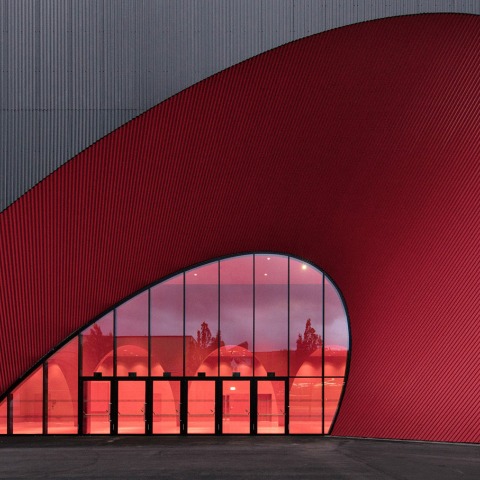 The backbone of the building is the interior circulation axis – room-high glazed openings guide visitors through the series of exhibition halls – red, black, red, black. As eye-catching as the elliptical, hyperbolic incisions in the two longitudinal sides of the buildings are, the color scheme of the giant is just as powerful and vivid – pure, rich colors without shading like those used in coats of arms.