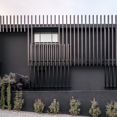 We also accented the openings with large protruding sheet metal angular frames, which project over vertical lathing with hollow sections, as a double skin on the building.