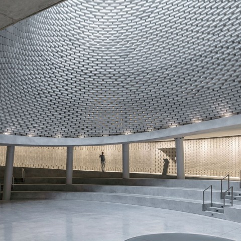 Set in a calm biblical scenery, but adjacent to the nowadays busy streets of Jerusalem, the space is isolated and quiet. It was excavated in the mountain to form an intimate space for both personal and collective experiences of commemoration. Above the hall, the mountain is reconstructed of curved topographies made of Jerusalem stone. An undulating funnel-shaped formation of bricks opens the excavated hall to the sky. Its irregular vortex shape floods the space with ever- changing natural light.