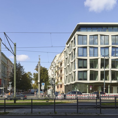 On the 464 m² corner site between Greifswalder Str. and Heinrich-Roller-Str. in the Berlin district of Pankow, Prenzlauer Berg, an office building was created whose expressive, lively main façade with its floor-to-ceiling, square grid structure of light architectural concrete prefabricated parts immediately strikes the eye.