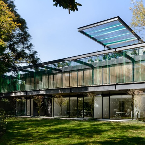 The living spaces in the first level have terraces and views to the exterior between and through a façade woven of plastic cables that sieve and melt together with the thick vegetation of the existing trees.