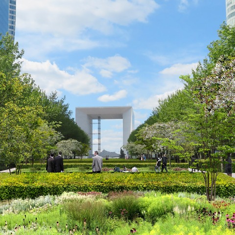 The transformation of the former administrative city was designed in close collaboration with the architect David Chipperfeld. The north-facing courtyard, initially open, was transformed into an enclosed garden surrounded by a cloister. This choice had the unexpected effect of enlarging the space thanks to the depth of the vaults distancing the garden from the facades. The presence of underground parking lots induces a microtopography on the surface in order to provide the critical mass of soil necessary for planting. A densely planted landscape, a miniature forest with undergrowth plant species, is placed in the direct extension of the public space. The highest roof terraces accommodate a system of vertical cultivation which, artificially, multiplies the surfaces exposed to the sun, while remaining accessible to gardeners.