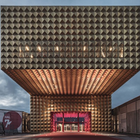 Ragnarock, designed for the Danmarks Rockmuseum, aims to touch the existing site as lightly as possible with the intention to preserve the raw and informal character of the site which has been, and still is, used by skaters and artists alike. The new structure plugs into the factories, standing on four legs which take visitors up into the museum and auditorium above. A clear divide, identified by a separation in materials, distinguishes the old and the new; raw concrete in contrast with vivid red studs. The combination of materials radiate a rock-like atmosphere; from the golden anodised aluminium studded façade which pays homage to lead singers throughout rock history, to the vivid red interior, reminiscent of a guitar case’s soft velvet inside.