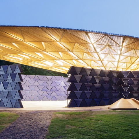 Fundamental to my architecture is a sense of openness. In the Pavilion this is achieved by the wall system, which is comprised of prefabricated wooden blocks assembled into triangular modules with slight gaps, or apertures, between them. This gives a lightness and transparency to the building enclosure. The composition of the curved walls is split into four elements, creating four different access points to the Pavilion. Detached from the roof canopy, these elements allow air to circulate freely throughout.