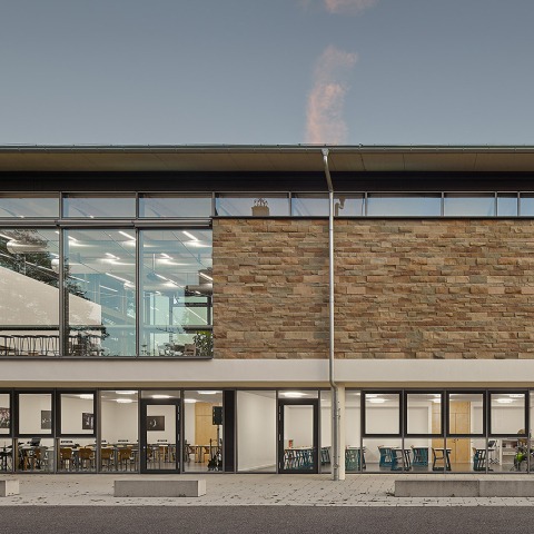 The building has a sandstone masonry façade to facilitate its integration with the other historic buildings of the school and surrounding area, such as the Neuenstein Castle. To achieve abundant natural light, the façade also features large openings that create a contrast between the sandstone and the large transparencies within them. Durable and industrial materials were used for the interior.