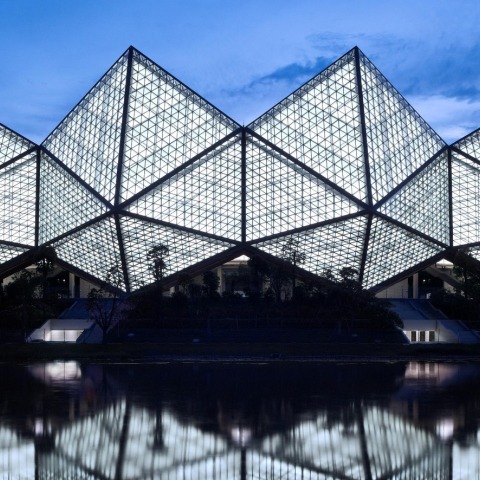 The overall complex is laid out as an extensive landscaped park with typical elements of a traditional Chinese garden. Watercourses and plants symbolize movement and development, while crystalline structures in the form of stones and rocks represent continuity and stability. The dialogue between the fluid landscape shapes and the expressive architecture of the stadia constitutes the conceptual framework of the design. The crystalline shape of the three stadia is additionally emphasized by the illumination of the translucent facades at night.