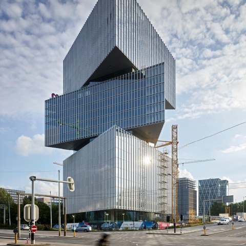 Dutch architecture firm OMA designed the structure, which is made from three triangular volumes stacked on top of each other, a totemic image, in reference to the surrounding urban context in Europaplein area.