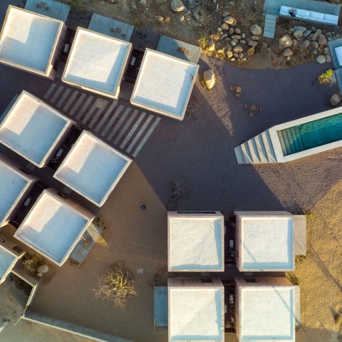 It is made up of four modules (cubes) with one floor and equal dimensions: a living room with a kitchen and three rooms with individual bathrooms. Each of the four cubes is integrated into the exterior through a sliding gate that acts as a façade. From the inside, it is a window and a passage towards an architecture of geometries that unfold in the desert and the sea. From the outside, the gates reflect and multiply the structures and the landscape to the rhythm of the sun, the shadows and the moon.