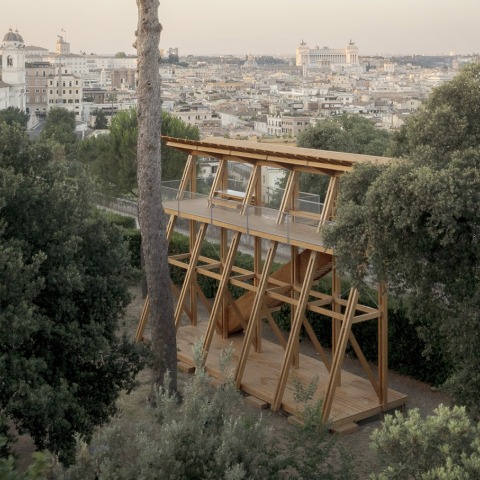 The installation provides an elevated public space at the level of the garden's trees, whose canopies, although growing there for centuries, will not remain forever. The structure comprises six timber porticos that support two platforms: one at ground level and another 7 meters high. The first one welcomes visitors and hosts public events, while the second one serves as an observation deck. It features rocking chairs, benches, and a picnic table, allowing visitors to enjoy a break from the Roman summer. A cross-laminated timber staircase braces the structure diagonally, replicating the same number of steps as the historical helical staircase inside the palace. The structure culminates in a V-shaped canopy that protects the observatory from the sun and rain, providing shade and welcoming the breeze running over the hill. The project is designed to be assembled and disassembled, and to guarantee wind resistance without standard foundations, 16 water storage bags of 260 liters are installed beneath the ground platform.