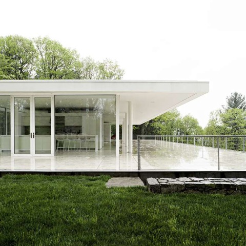 And to protect ourselves from the sun and rain, over the stone plane we raise a light roof 100 feet long by 40 feet wide by 9 feet tall, held by 10 cylindrical steel pillars that are arranged according to a 20 x 20 foot grid. This roof cantilevers 10 feet along all of its sides. And to make this space habitable, we put a glass box under the roof, an enclosure measuring 94 feet long by 25 feet wide. This glass box contains the back row of columns within it and leaves the front columns outside, in order to further accentuate its transparency.