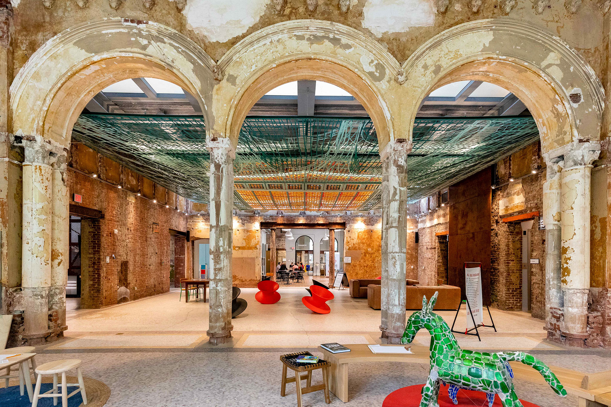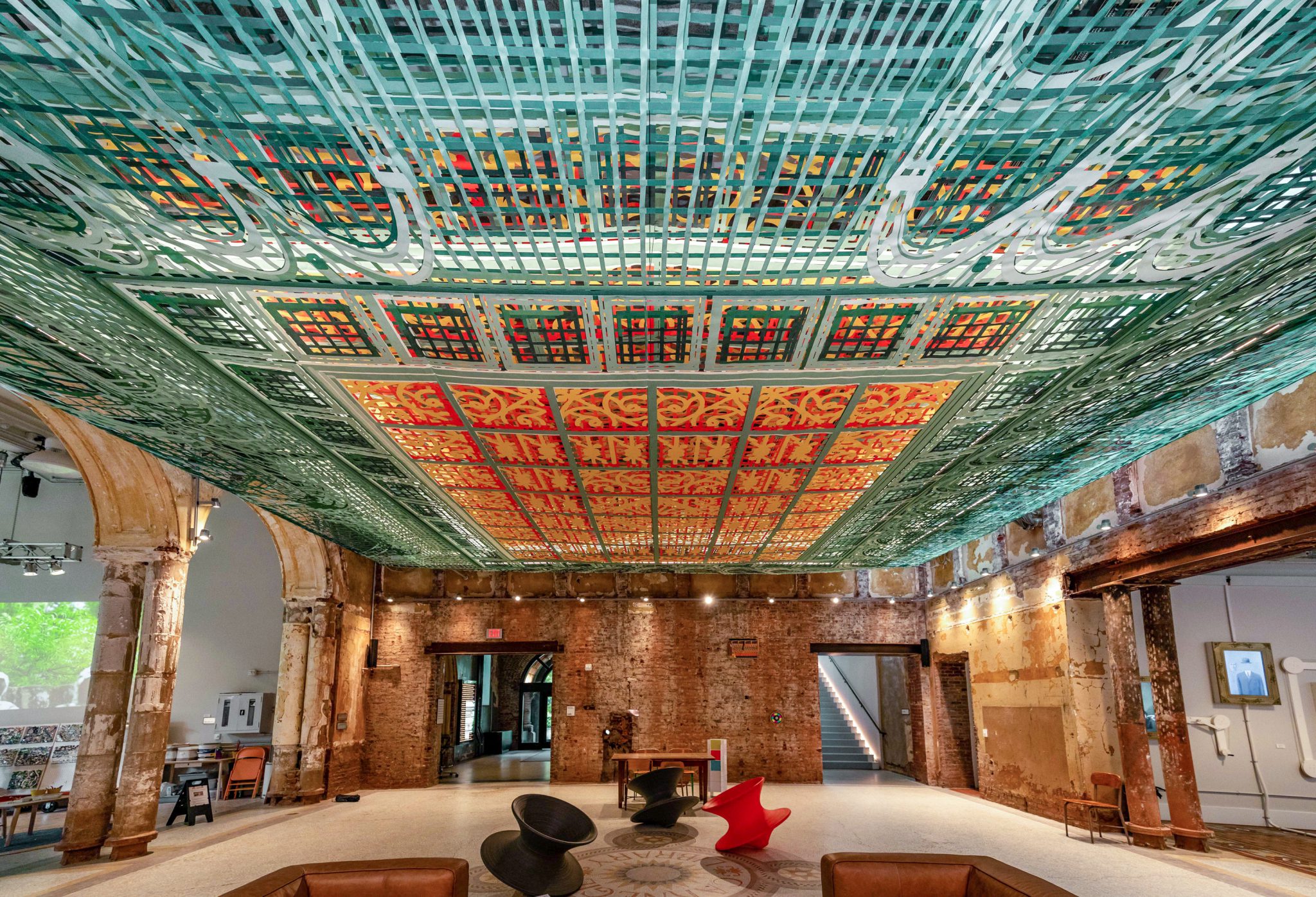 Brennan Buck, partner at FreelandBuck shares, "The intricacy of the original ceiling, allowed us to create a dense cloud of lines overhead while clearly evoking the ornamental style of the original building." Through the power of depth perspectives Over View creates an illusionary visual showcasing an intricate pattern of lines and abstractions. The project installation was commissioned in an effort to help restore the historic building in order to provide a new museum for older kids looking to experience and learn art technology.