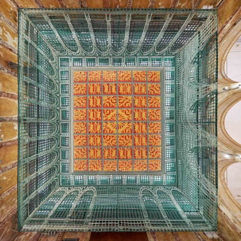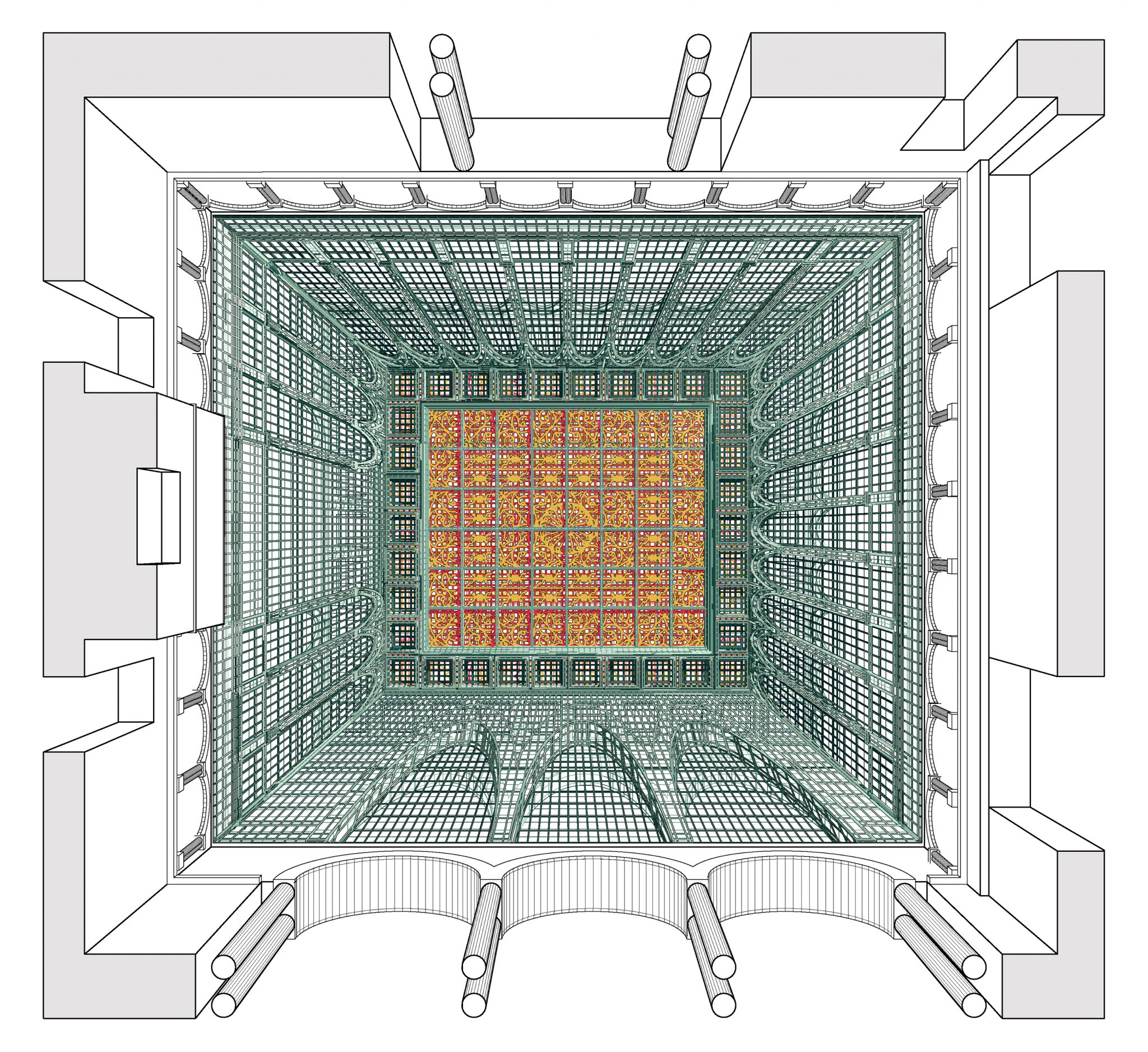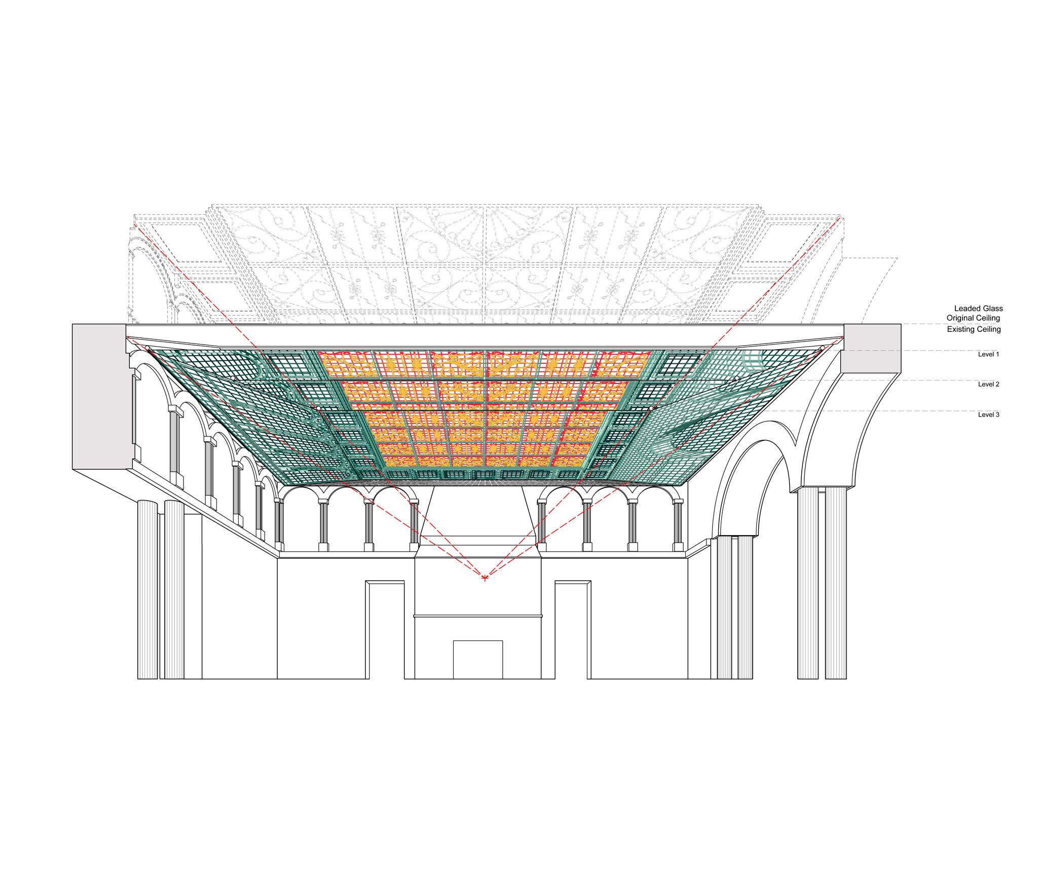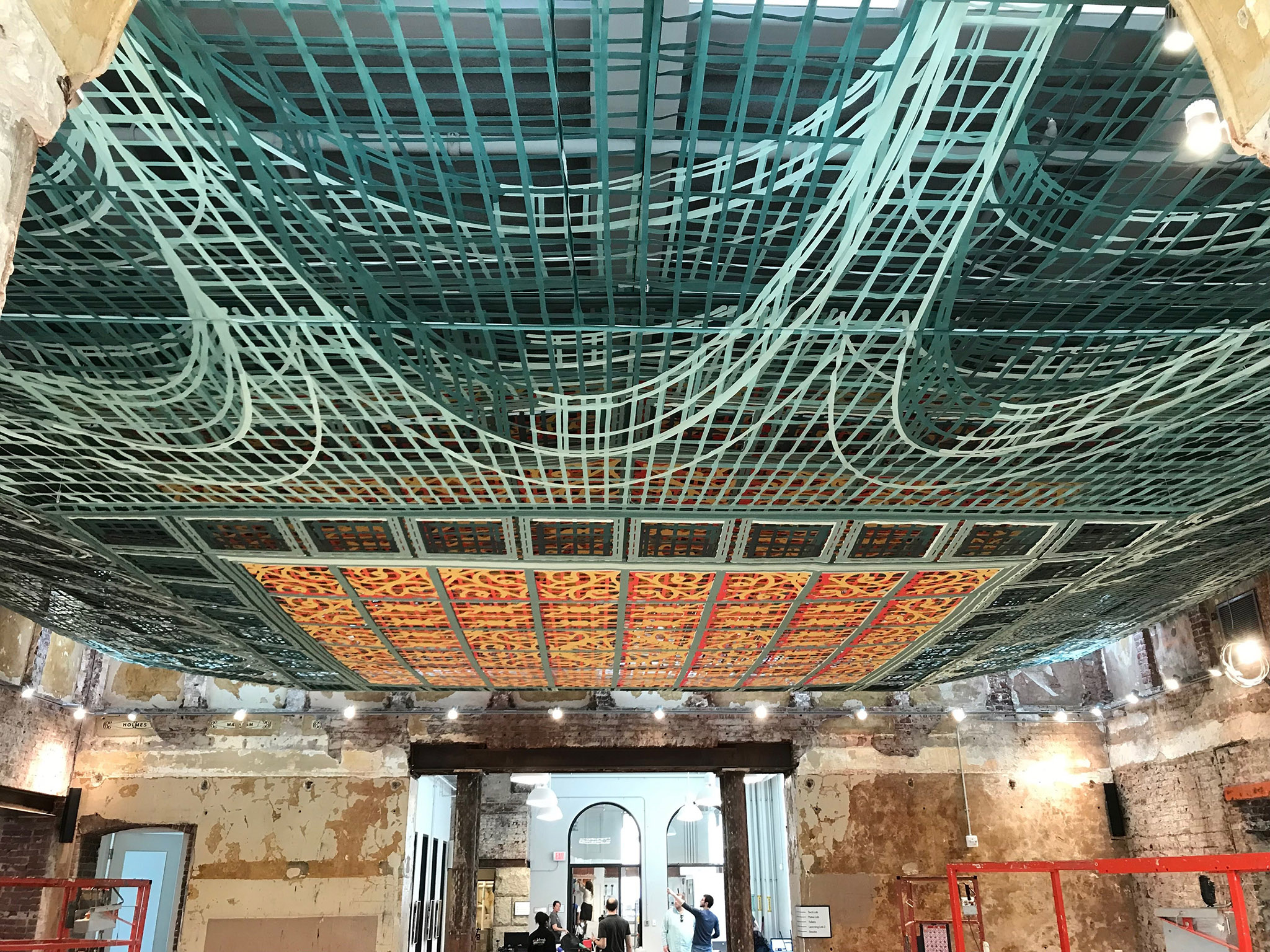 The work expand their exploration of three-dimensional drawing, and is inspired by Renaissance era trompe l'oeil ceilings. The piece recreates the ornamental elements and geometries that correspond to a former leaded glass ceiling, before its renovation in the 1970s, that was installed above the room where the "three-dimensional" drawing is currently located.