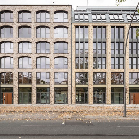 The normal storeys of the building sections were given different beige and colourful facades made of clinker brickwork with differentiated divisions. The building section on the right-hand side of the street was provided with a two-storey base zone and a three-storey, vertically structured central area, to which the two-storey roof area with a titanium zinc pitched roof is connected. The building on the left also has a twostorey base area, but above it is a four storey central area with glazed, large-format windows in segmental arches as a reference to early industrial modernism. This part of the building was given a staggered storey with a flat roof. Following the Berlin building tradition, the courtyard sides have a reduced design, with smaller window openings and a composite thermal insulation system façade with clinker brick slips in the same colour spectrum as the street façades.