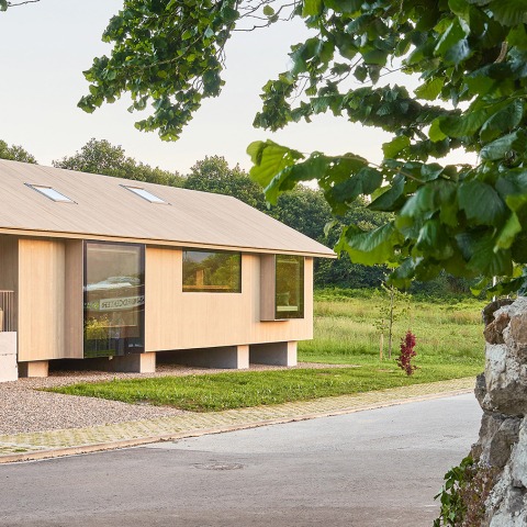 The gabled roof over the entire house expels the rain, creating an intense curtain in front of the large windows and collecting it around the perimeter of the house at ground level. Access to the house is via the central part of the convex north side. At this point, a large open hall is formed that provides shelter for vehicles and the main entrance to the house. Inside, forty-six rooms of different sizes, corresponding to the degree of privacy, are linked throughout the house. Larger common spaces are complemented by smaller intimate spaces that shelter the individual without segregating him from the rest of the inhabitants. The total construction in wood accentuates the feeling of shelter throughout the house and especially in the spaces of contact with the body where the house becomes furniture. The structure is made of larch cross-laminated wood. The insulation is made of wood fibres and cork. The façade and roof cladding is made of acetylated radiata pine finished with a grey silicate-based mineral patina.