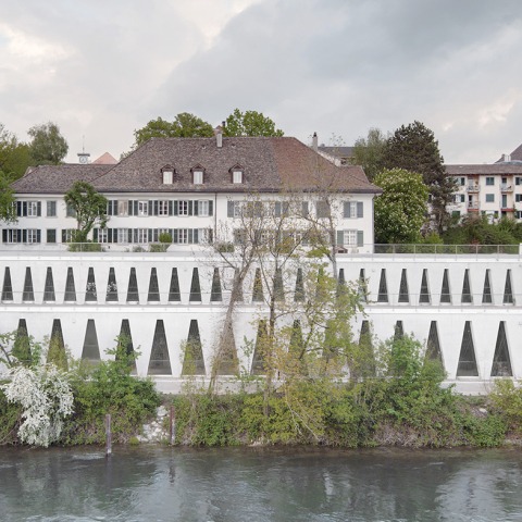 The new building designed by Barozzi / Veiga is integrated into the slope with a stepped design that reduces its visual impact towards the river. The fragmentation of the project dissolves its image that is barely perceived from the outside. Two structural bands that create terraces and landscaped roofs as an exterior extension of the building and as possible walks near the Limmat river.