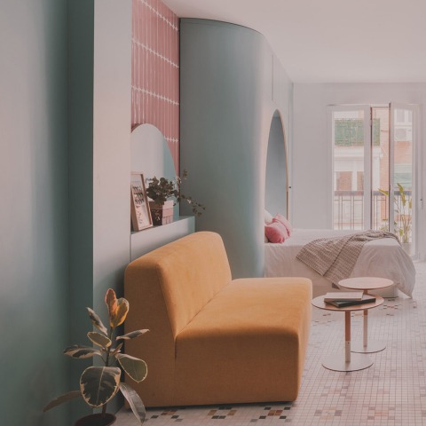 Ceramics, for example, is a splendid material deeply rooted in Spanish culture since the Arab tradition, and even earlier. By selecting expressive and evocative pieces and placing them in unexpected locations, we transform a space into something distinct and special. In the living room of TUR House, a ceramic wainscot evokes the feeling of an outdoor patio, while the intentionally childlike bedroom extends into the living room like a cloud drifting through a landscape where a lamp becomes the sun. The IKEA kitchen is personalized with a wood-paneled countertop, and the simple white doors are enhanced with panels that reflect the shapes and color palette of the rest of the home. All of this is combined with carefully selected, well-designed furniture at affordable prices.