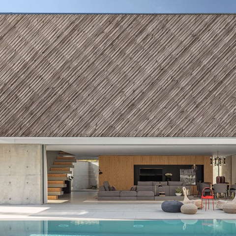 The containing wall, that starts in the outlines of the underground garage, maims the ground and ends at the outlines of the tangent limit of the swimming pool, and represents the rotation of the volume in a negative way, located on the top of the laIer. This monolith is coated in wood, with diagonal rulers, alluding to a mere nest that surrounds the private area of the house. Concrete and wood merge on a shade of grays, in a constant chromatic mutation.