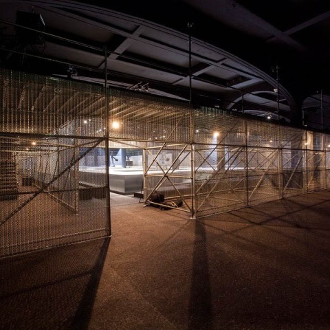 The majority of the audience is orderly arranged around the central stage, while the room is bordered on all sides by metal scaffolding serving as balcony to the rest of the public. Different geometric excavations punctuate the central stage; surprisingly part of the audience sits inside these pockets, becoming part of the overall scenography.