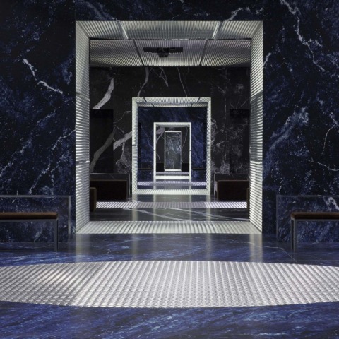 The interiors of Infinite Palace, designed by AMO, are clad with a blue and black marble effect, transforming the volume into a disorienting three-dimensional landscape. The floor is lined with geometric aluminum inserts that provide a sense of continual movement and delineating the spatial configuration in this performance space for Prada.