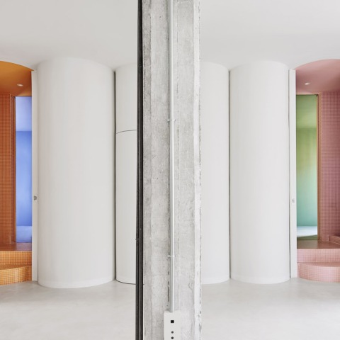 This 'cloud' is elevated concerning the ground level of the home to allow the passage of the facilities to the main downspout, but also to reinforce the transition from the public space, open and white, with a free height of 3 meters, to the private space, coloured and collected. Two large curved doors give way to these rooms. All the interior surfaces of this "filter space" are as if they were a single skin.