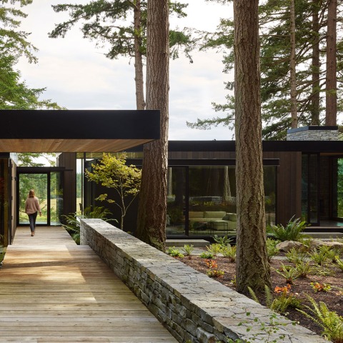 The house forms around a courtyard of natural grasses and ferns, with rooms themselves woven between mature cedar and fir. A low wall of stacked natural stone organizes the building and hints at the perimeter of the courtyard.