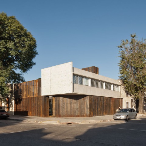 The implantation responds in the first instance to these guidelines. At the same time, the housing program is divided into two volumes whose activities could be distinguished as social and intimate respectively. These volumes are stacked one on top of the other to release the ground and create expansions to the outside that counteract the limited projections to the sidewalk. The social area is the one that touch the ground and also is separated from the edge of the property to avoid the restrictions that the ochava (chamfer limit) could impose to the interior space organization. Additionally, the corten steel shell appears to generate the boundary with the public space along the entire perimeter. The disposition of the ground floor allows to concentrate the service areas below the other volume encouraging to conceive the rest of the property as a single exterior space that is crossed by the living-dining area. A good orientation of the intimate area volume is considered a priority, therefore the bedrooms are projected to the northeast to get a favorable sunlight. The outer areas roofed below this volume are used for the for the main access, the garage and the secondary access.