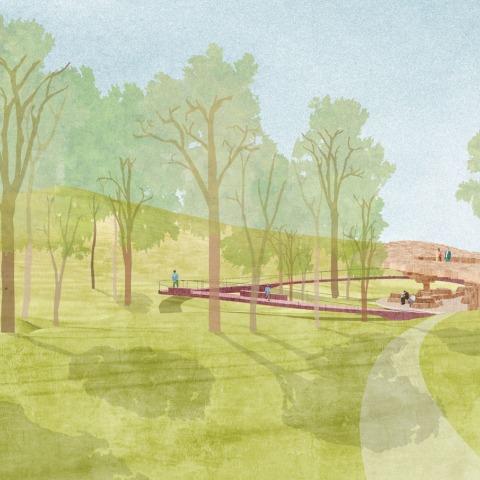 The Tippet Rise Pavilion consists of ponderosa pine and lodgepole pine logs, arranged in a round structure to create a “rain of light” effect, and sitting across the path of a circular bridge spanning an adjacent stream. The bridge features a number of seating areas positioned to accentuate views across the water, meadows, and hills, while sensitively touching the ground at only two points.