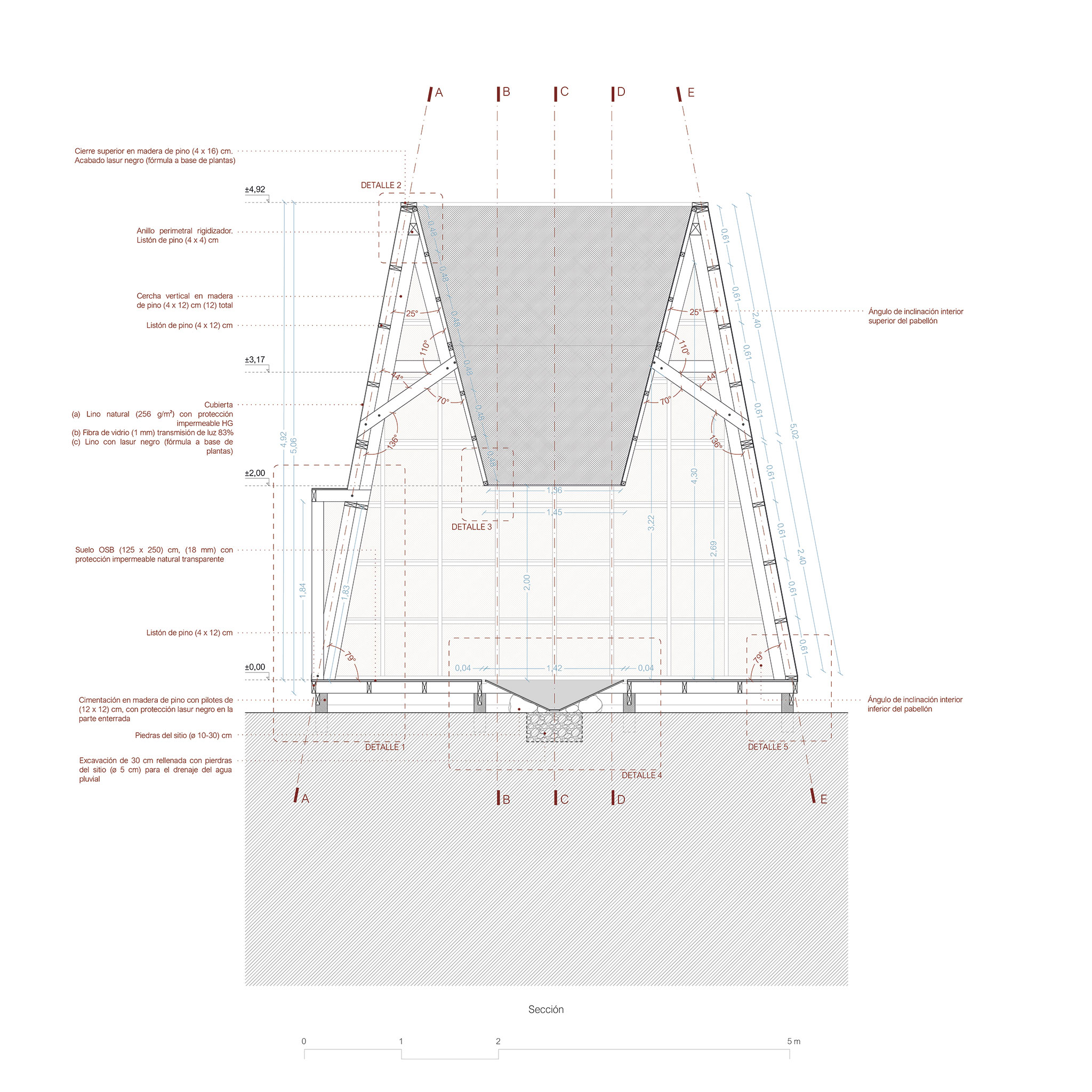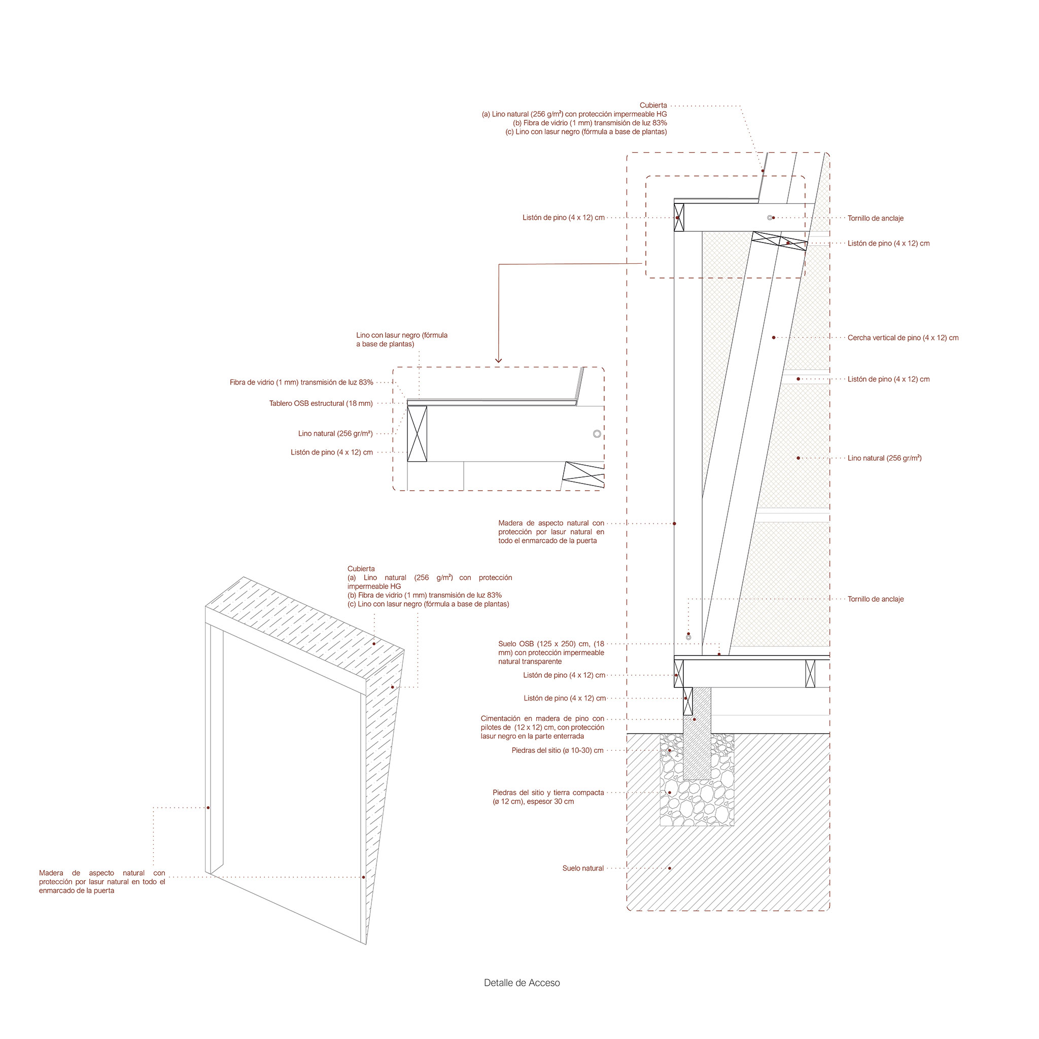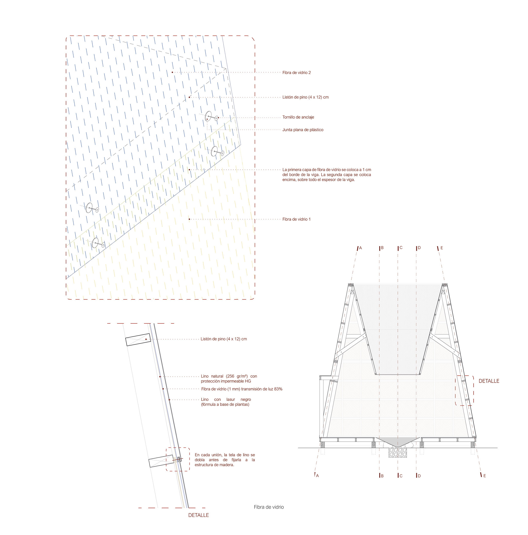 The material resolution seeks to maximize the sensory and perceptual experience of the space with the use of minimal elements, in this case only through three materials: a lightweight pine wood frame structure that gives form to the "water refuge"; The fiberglass with resin acts as a protective membrane, allowing light to pass through while providing a water-repellent envelope resistant to the passage of time. Finally, the linen, 100% locally produced, forms the exterior and interior skin of the pavilion in distinct ways, with a black stain on its outer surface and its natural expression on the inner, thus reinforcing the duality between shell and interior as an ambivalent exercise that enhances the spatial experience.