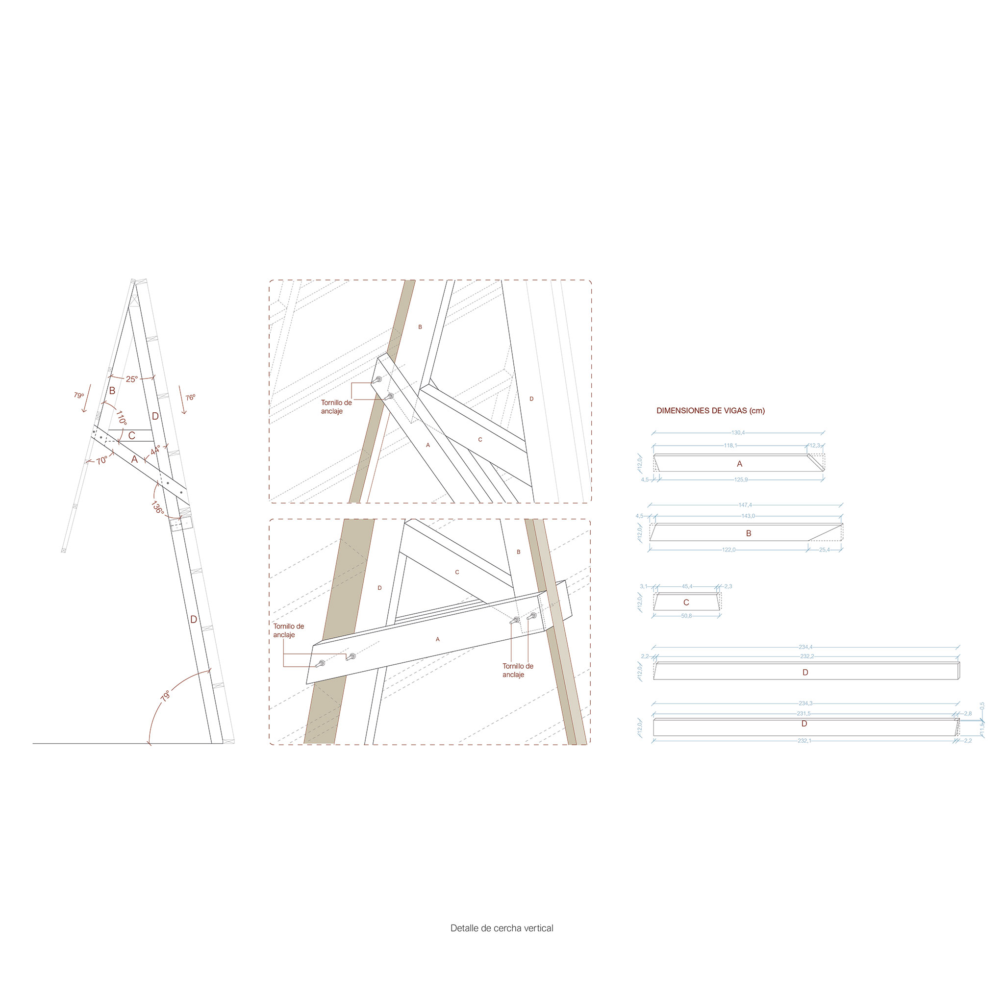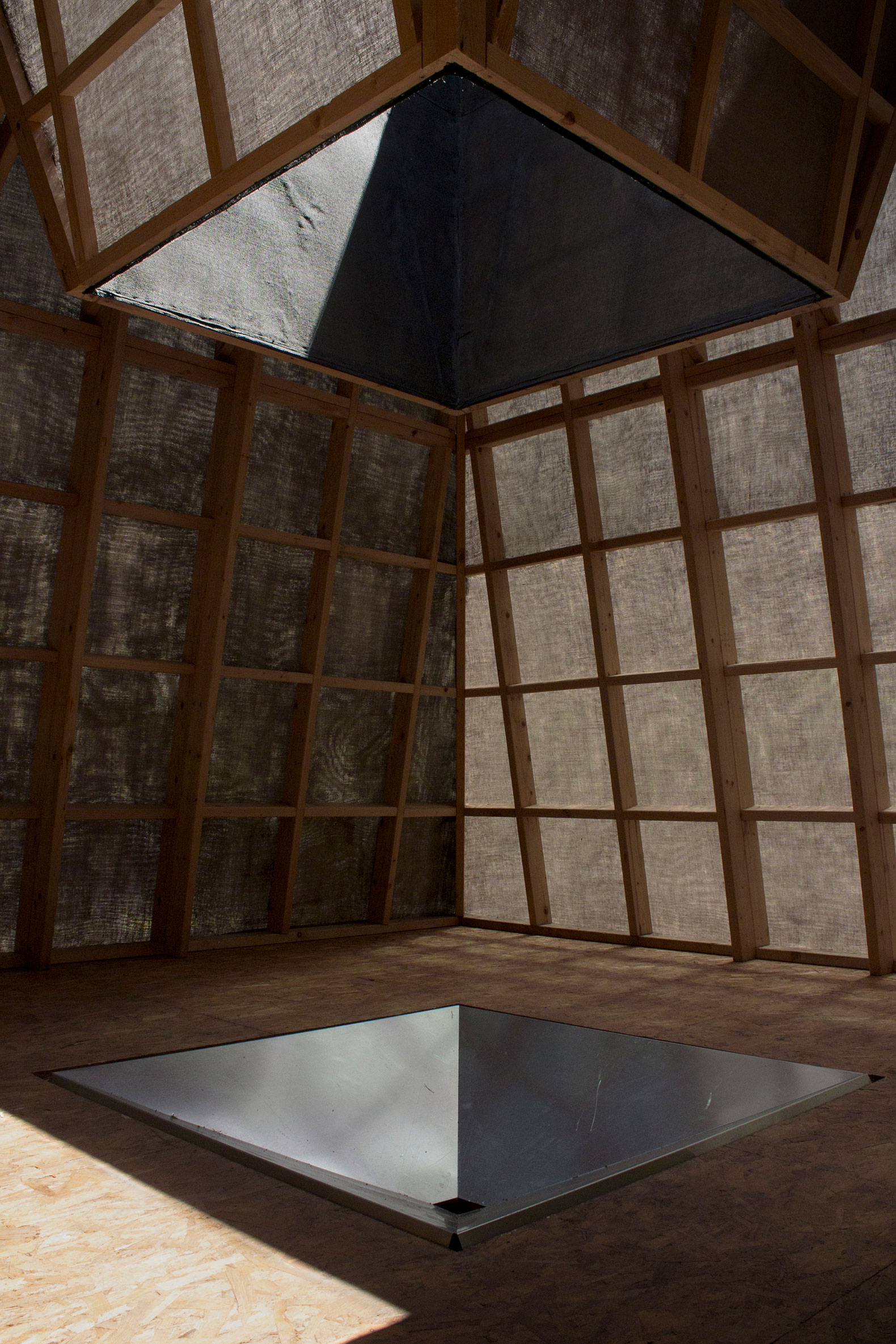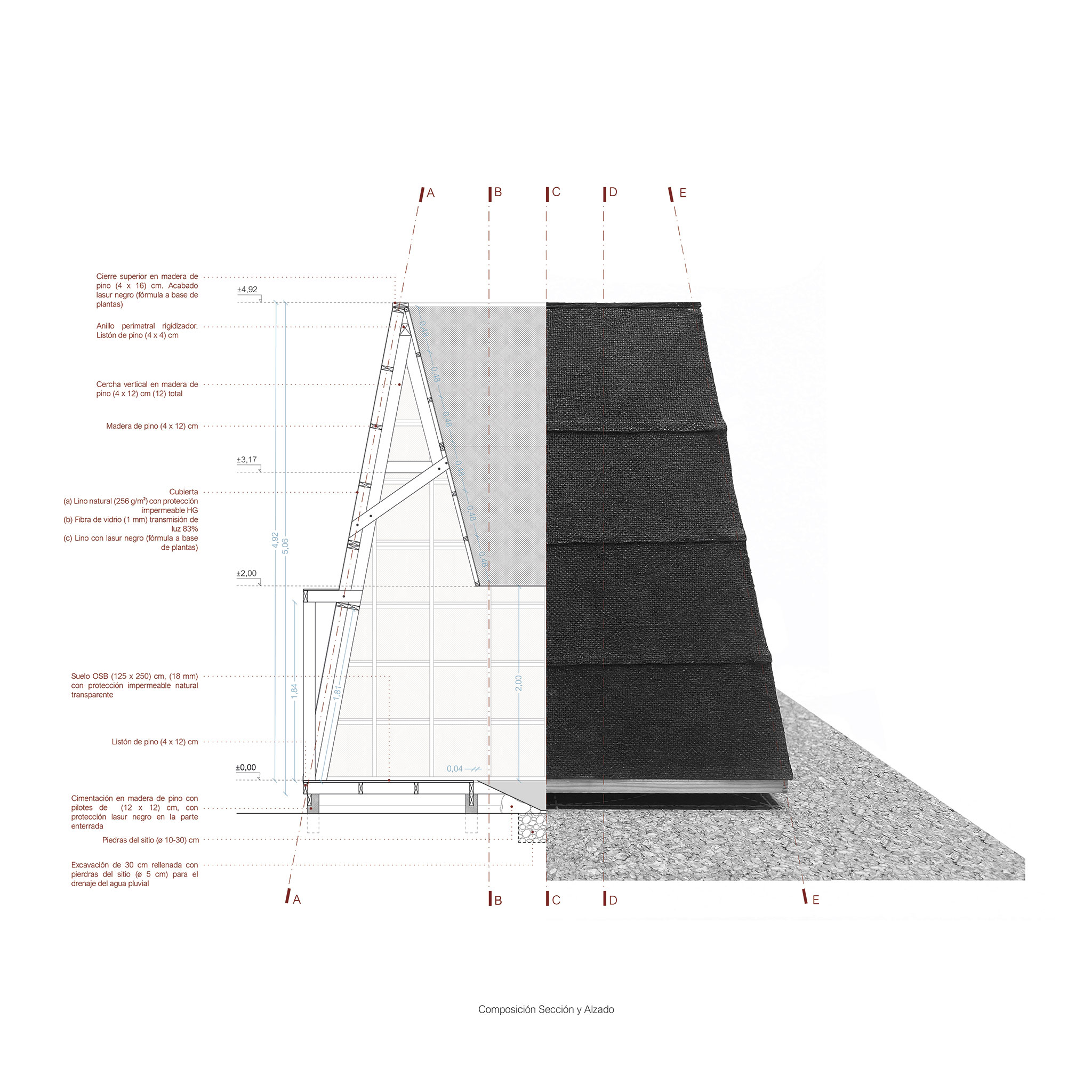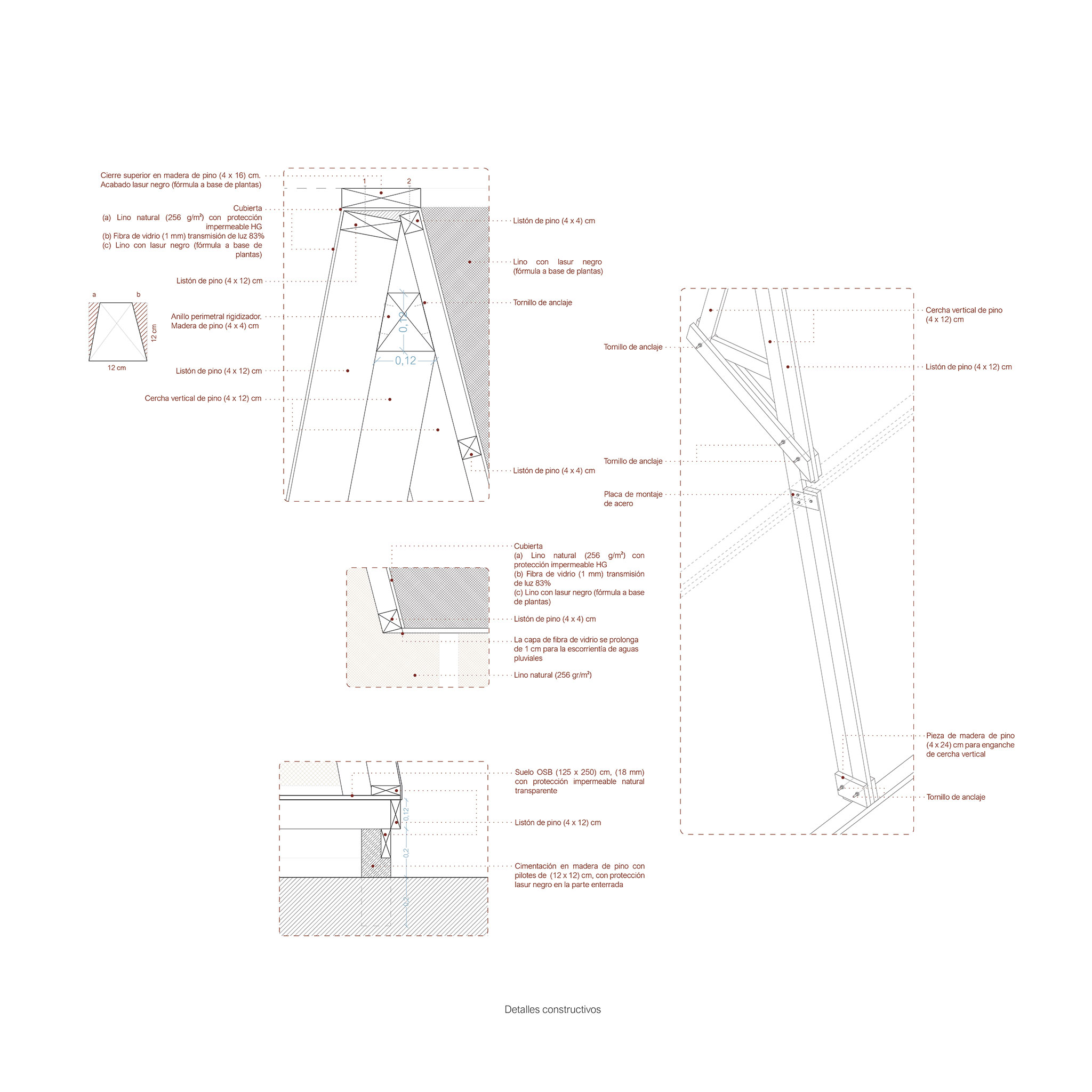 The material resolution seeks to maximize the sensory and perceptual experience of the space with the use of minimal elements, in this case only through three materials: a lightweight pine wood frame structure that gives form to the "water refuge"; The fiberglass with resin acts as a protective membrane, allowing light to pass through while providing a water-repellent envelope resistant to the passage of time. Finally, the linen, 100% locally produced, forms the exterior and interior skin of the pavilion in distinct ways, with a black stain on its outer surface and its natural expression on the inner, thus reinforcing the duality between shell and interior as an ambivalent exercise that enhances the spatial experience.