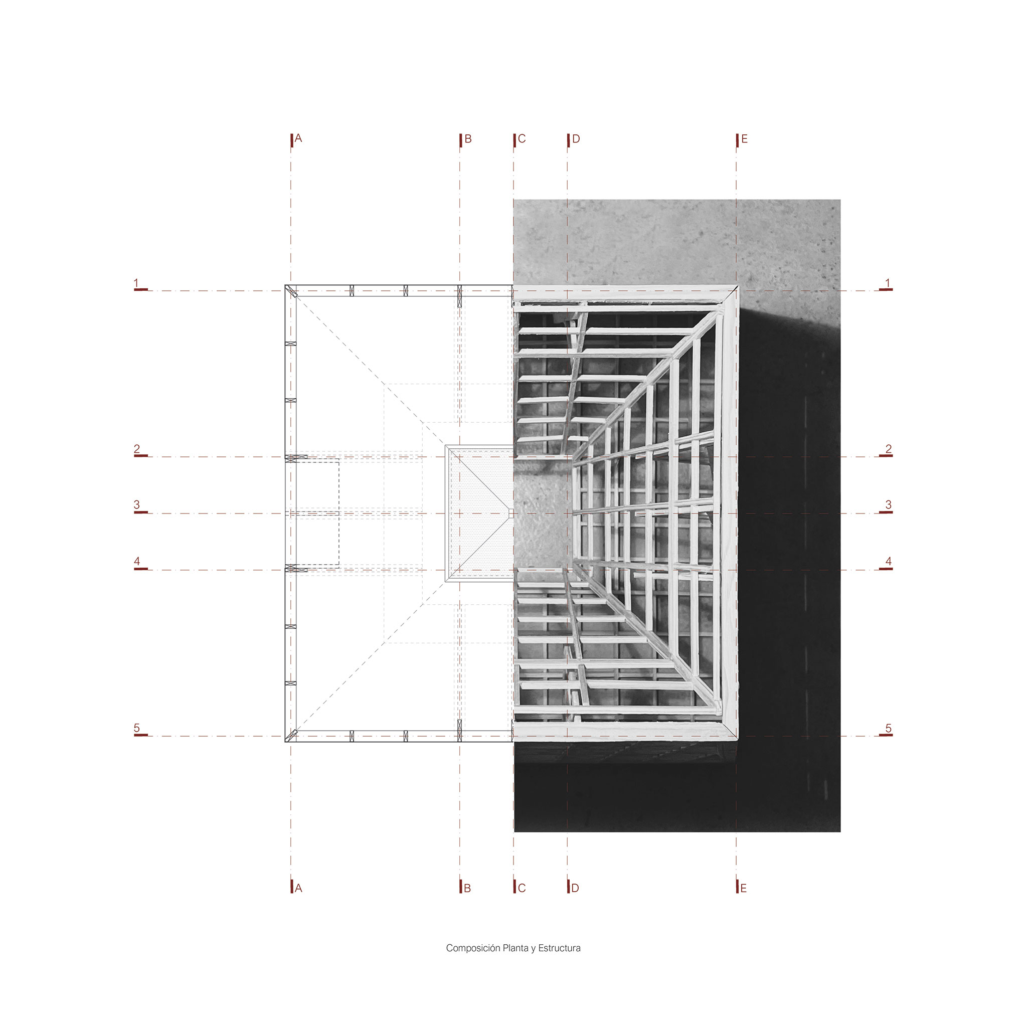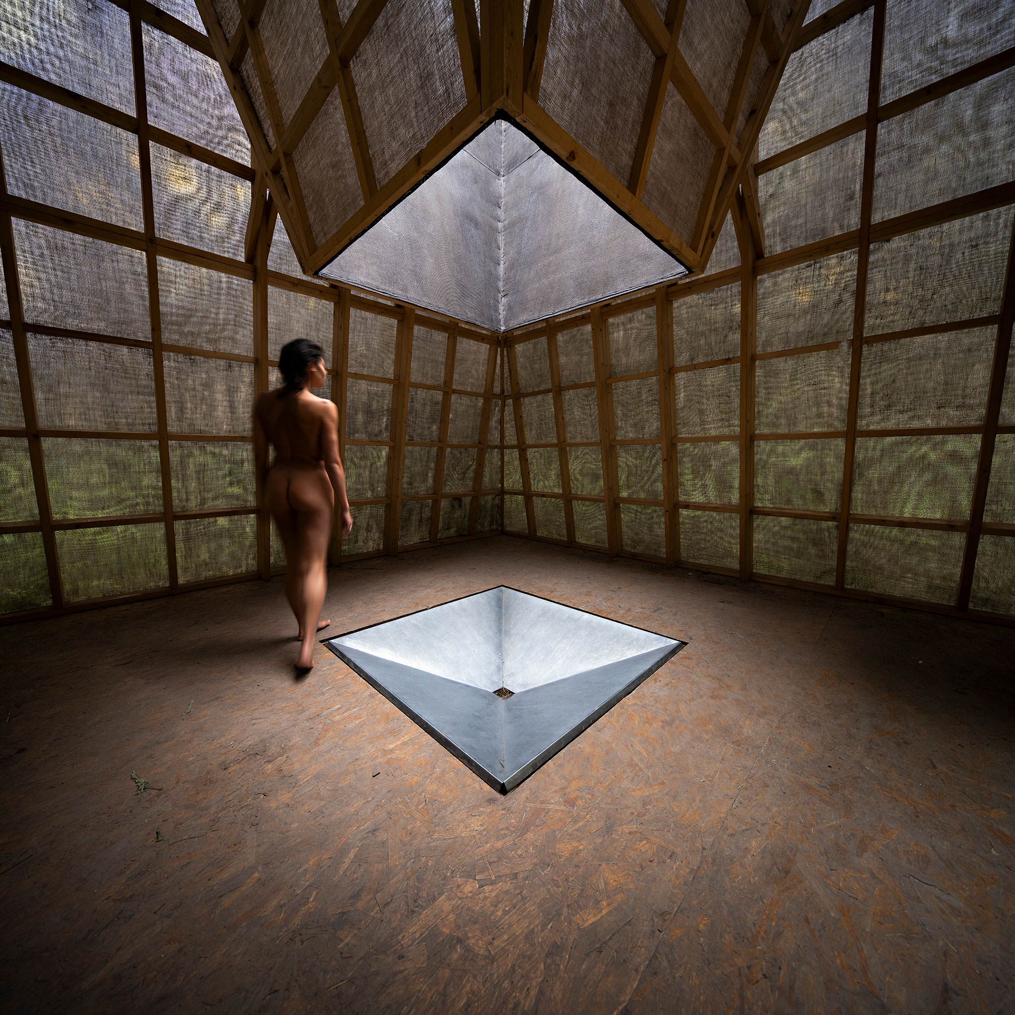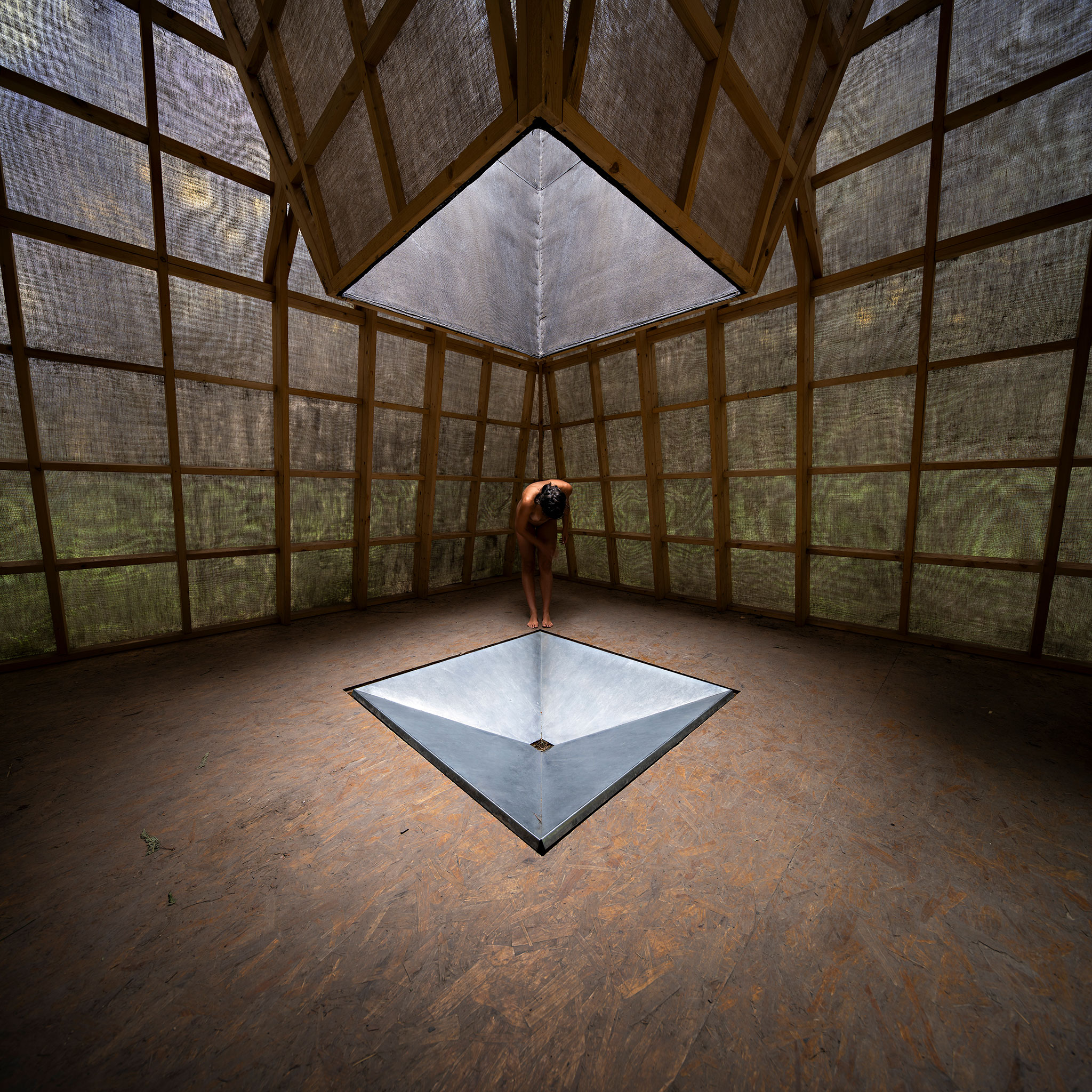 COMPLUVIUM is resolved through a geometric operation that articulates a central void from a virtual cube measuring 5 x 5 x 5 meters, where the inward-sloping roofs collect rainwater in the center of the pavilion, in the same way as in the Roman atrium, or as the Diola community of southern Senegal has done for centuries with their homes, in search of the necessary rainwater collection. The allusion to both references synthesizes our approach to the idea of a "spatial artifact," where, in this case, its activation by means of water has no other function than contemplation.