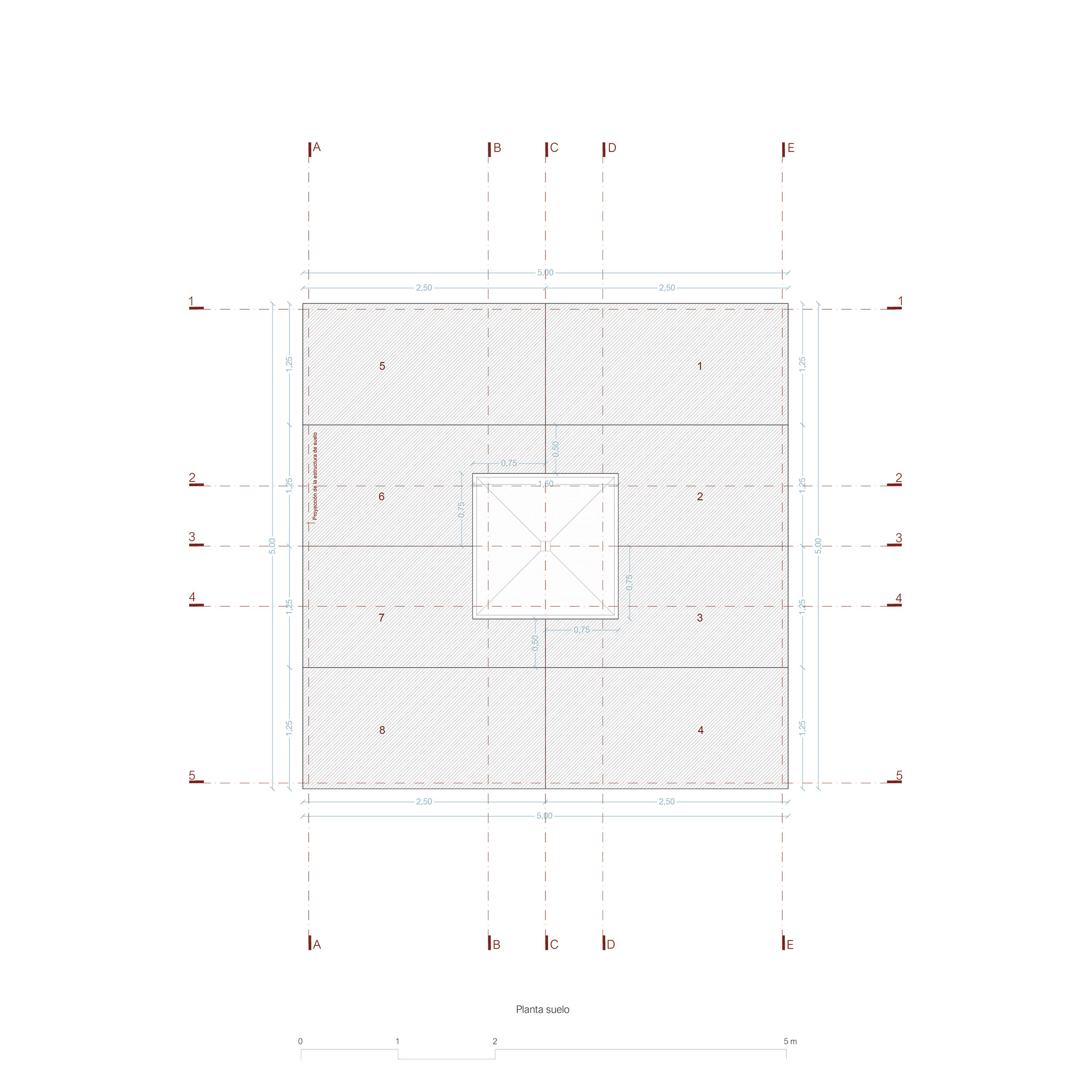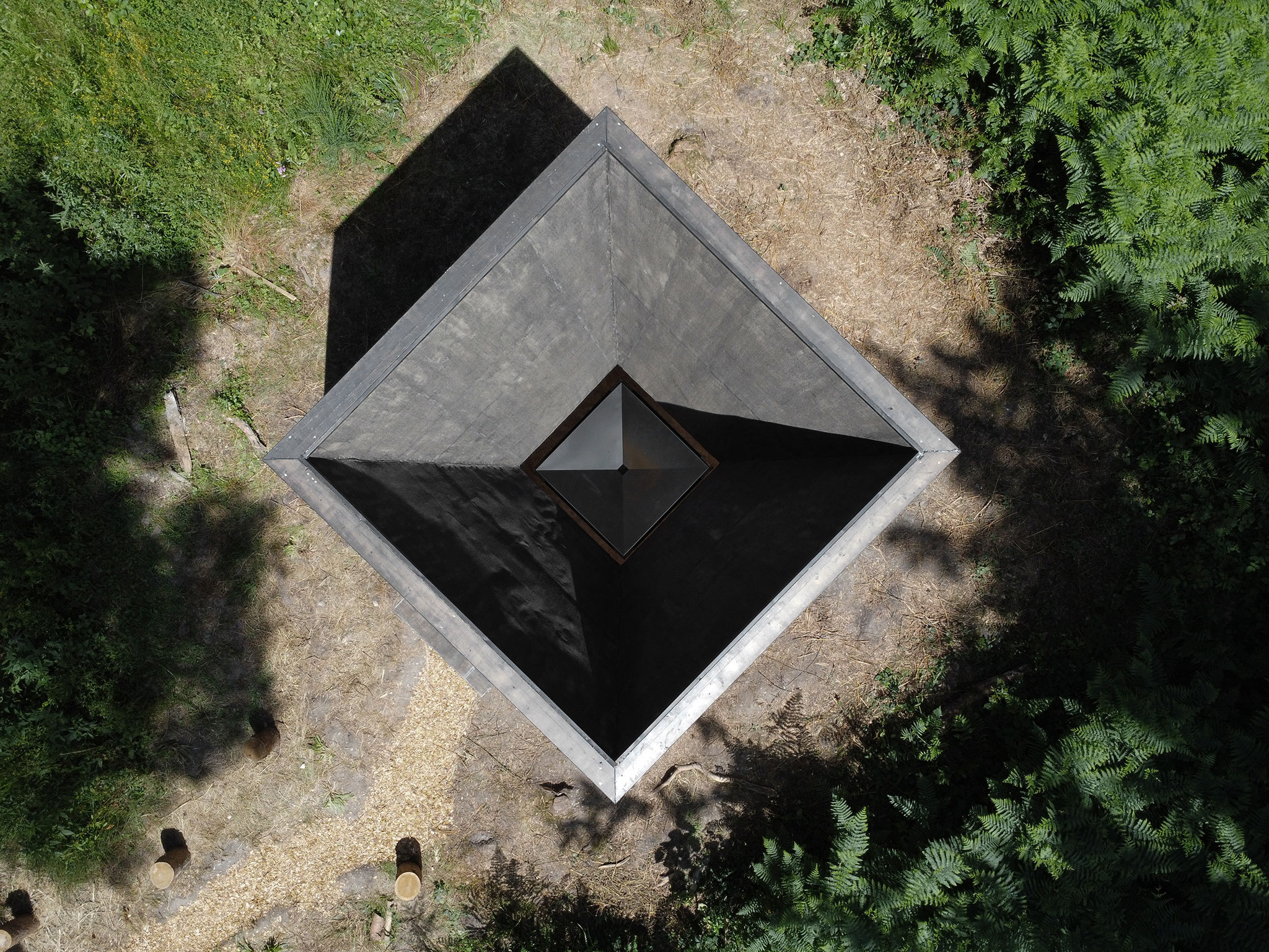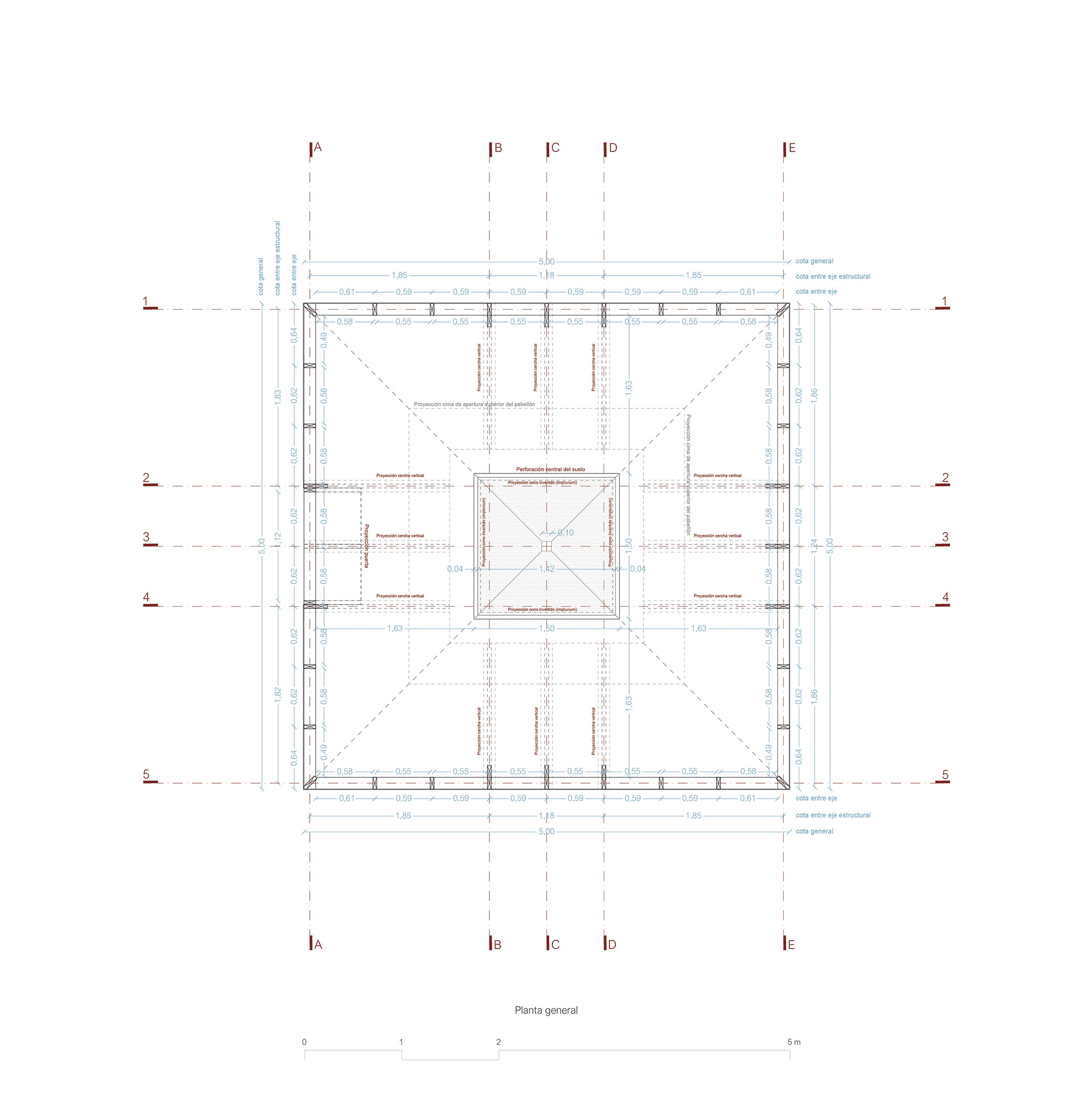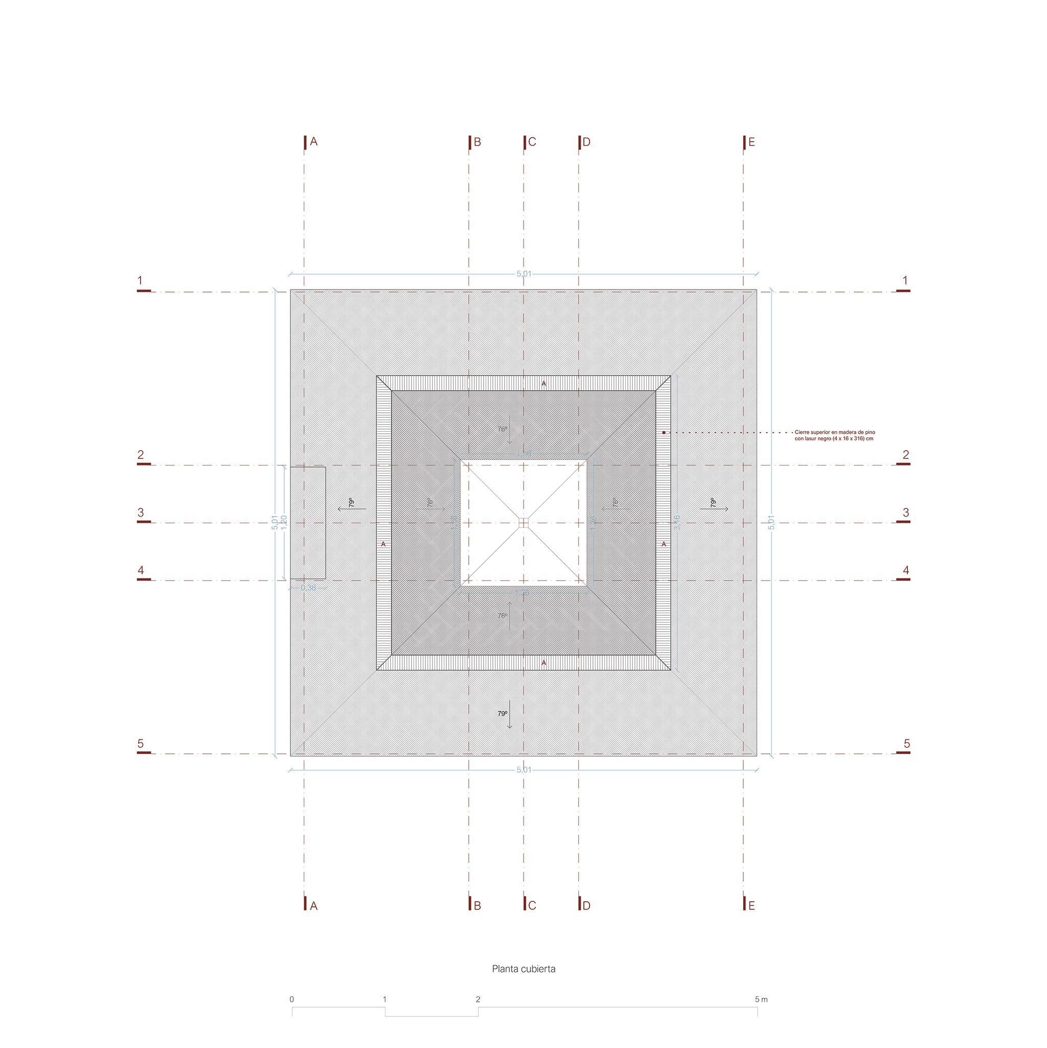 COMPLUVIUM is resolved through a geometric operation that articulates a central void from a virtual cube measuring 5 x 5 x 5 meters, where the inward-sloping roofs collect rainwater in the center of the pavilion, in the same way as in the Roman atrium, or as the Diola community of southern Senegal has done for centuries with their homes, in search of the necessary rainwater collection. The allusion to both references synthesizes our approach to the idea of a "spatial artifact," where, in this case, its activation by means of water has no other function than contemplation.