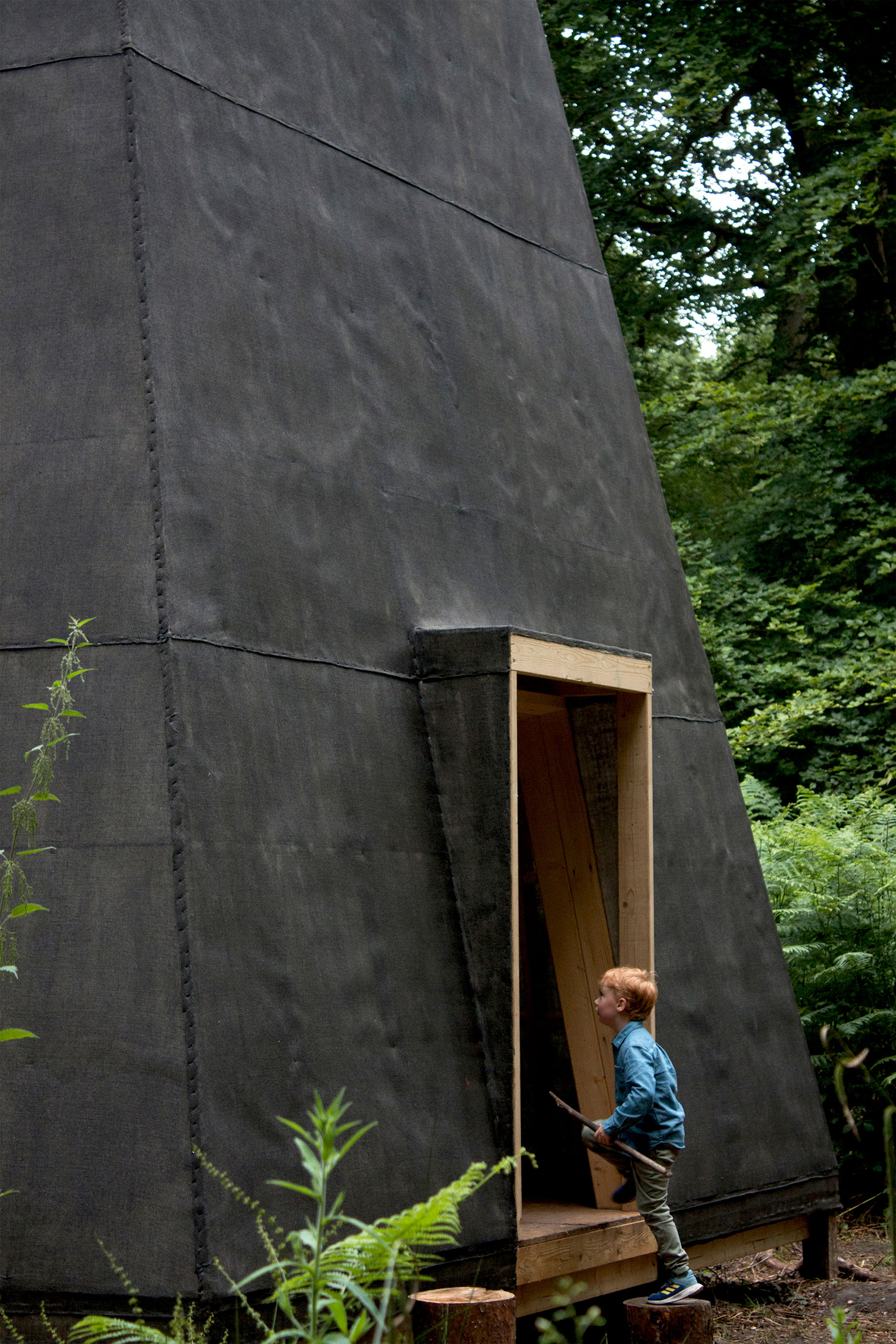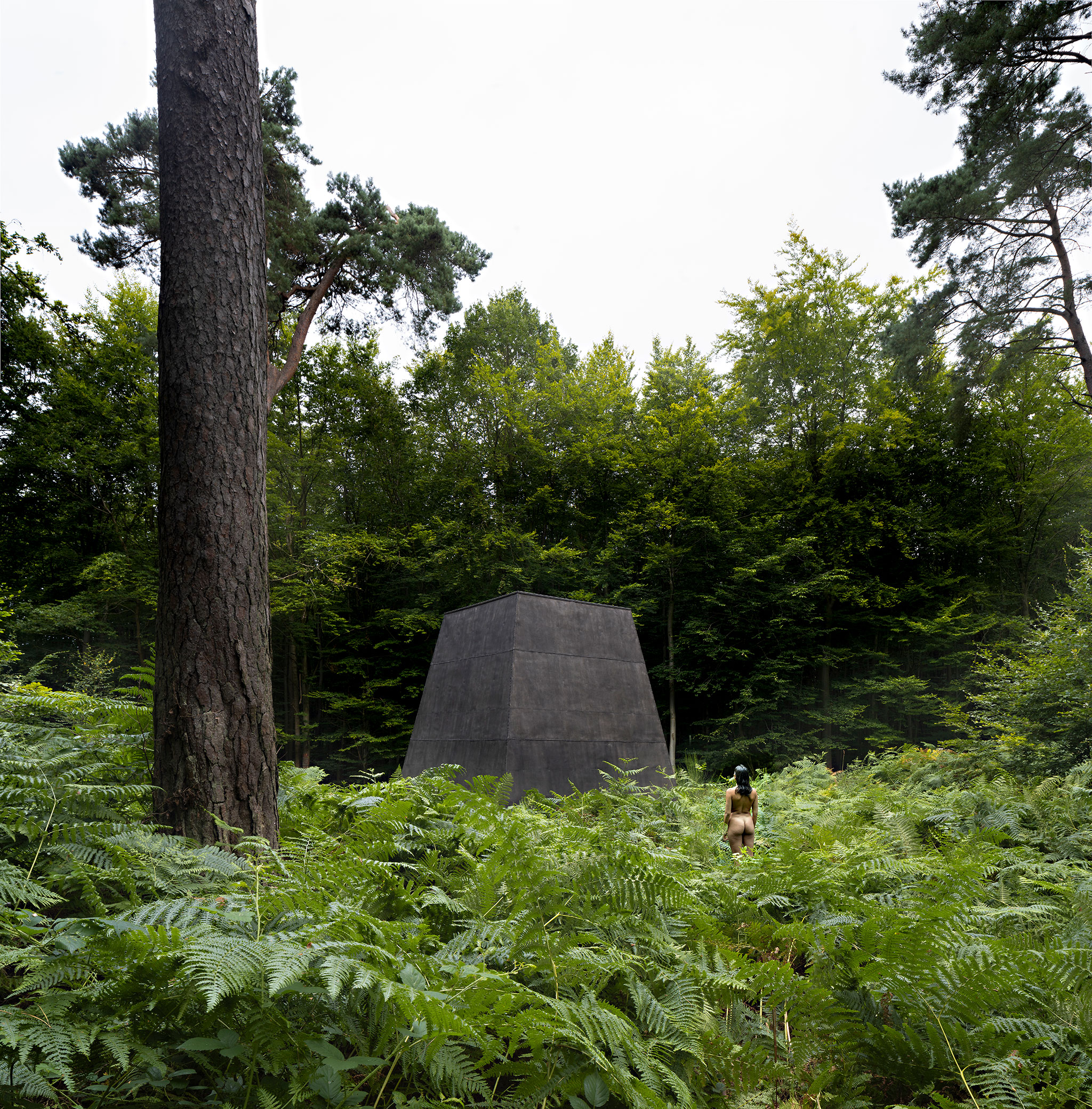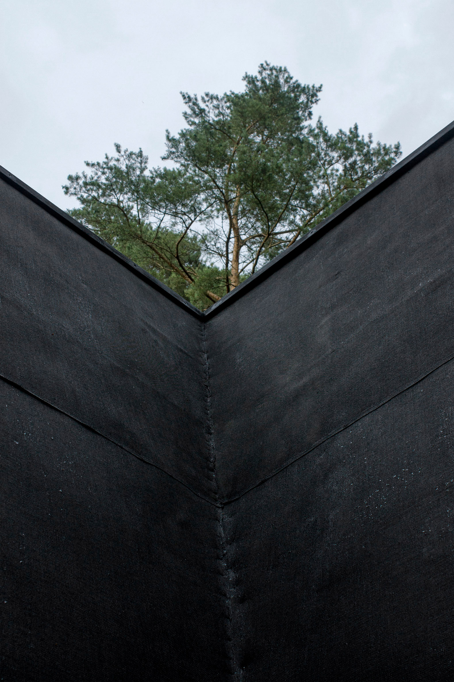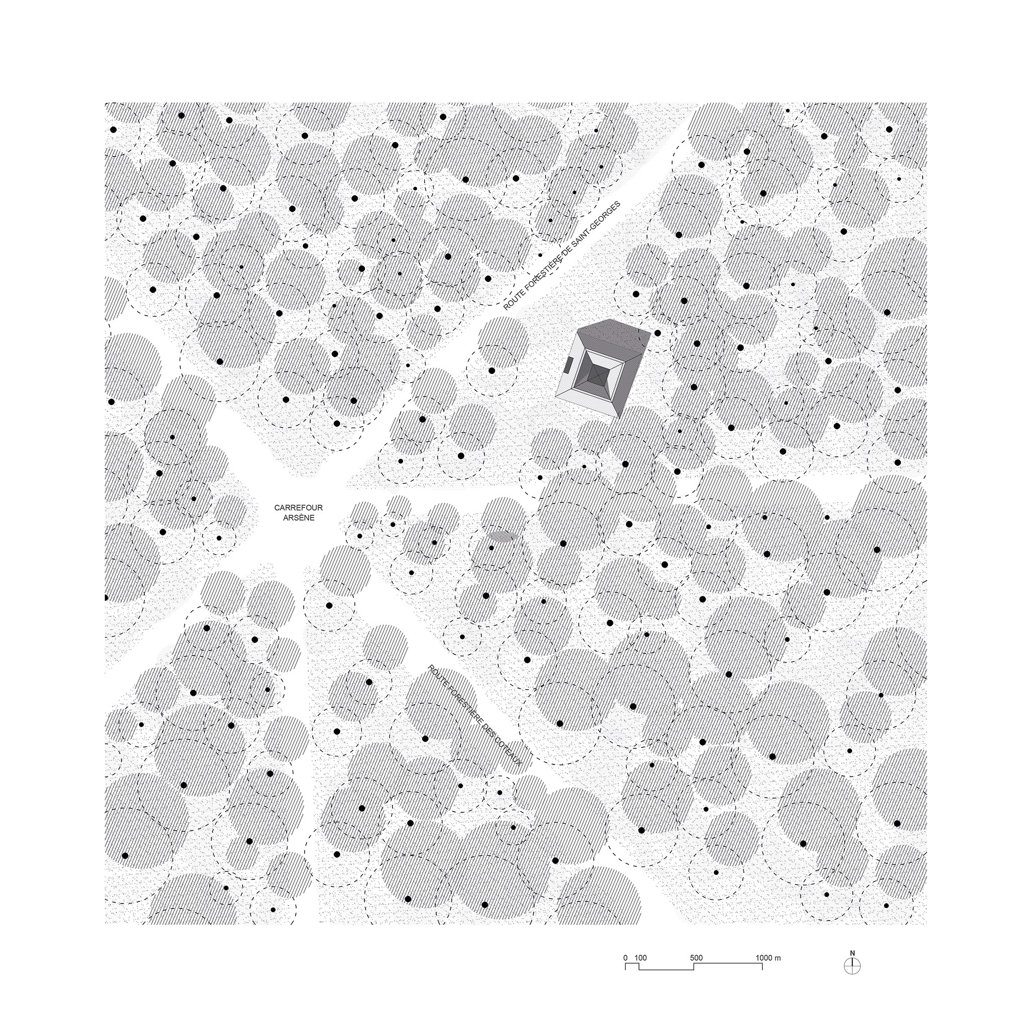 COMPLUVIUM stands as an allegory to water, seeking to highlight the most characteristic climatic condition of Rouen and the wooded surroundings of Canteleu: the abundant rainfall throughout the year. It is a timeless "spatial artifact" which, on the one hand, is defined by a recognizable geometry, in clear contrast to the natural environment, and, on the other, subtly attempts to disappear through the use of linen and fiberglass skins—materials that, upon contact with light, transform their appearance and ultimately blend into the landscape.