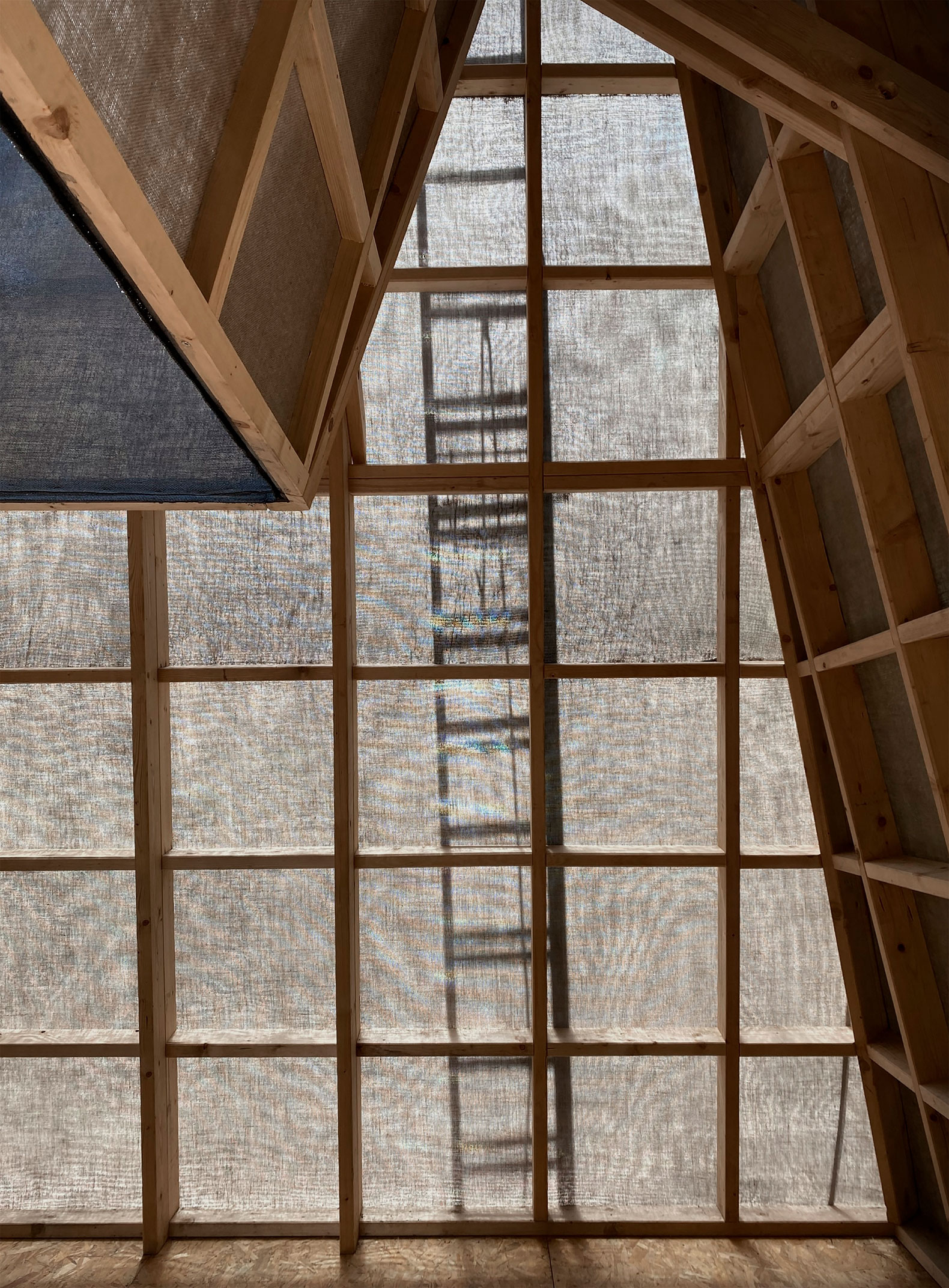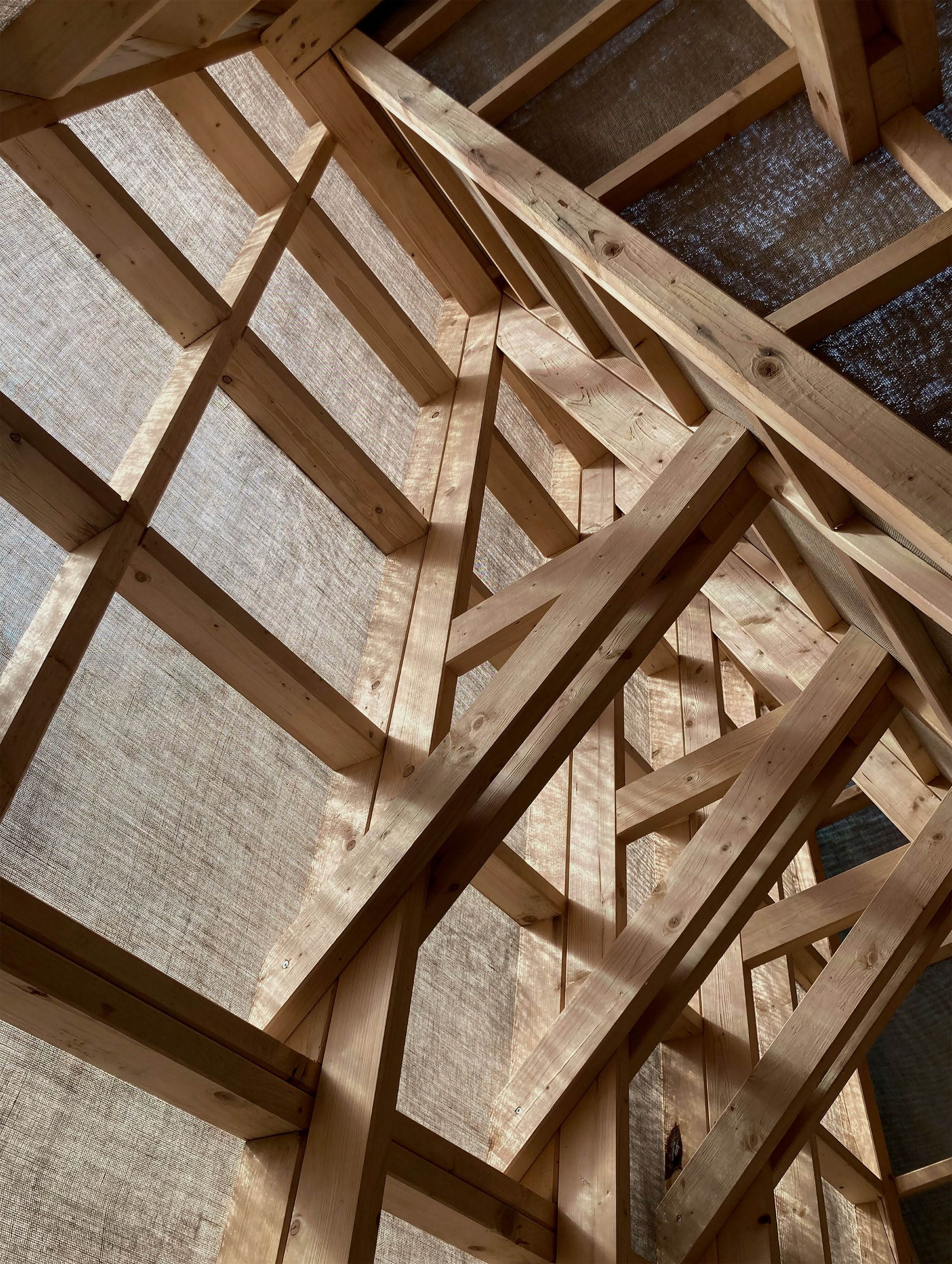 In this way, wood, linen, and fiberglass establish a complex dialogue between "skins" of different natures that, ultimately, nuance the spatial atmosphere and define a precise link between interior and exterior. Similarly, wood and linen directly reference the architectural and cultural tradition and identity of Normandy, a theme found both in the "colombage" typology of houses with exposed timber framing and in the local production of linen. COMPLUVIUM is thus resolved in a relationship between two recognizable materials that are part of the constructive memory of Rouen, in an attempt to establish a conscious relationship between territory, architecture and memory.