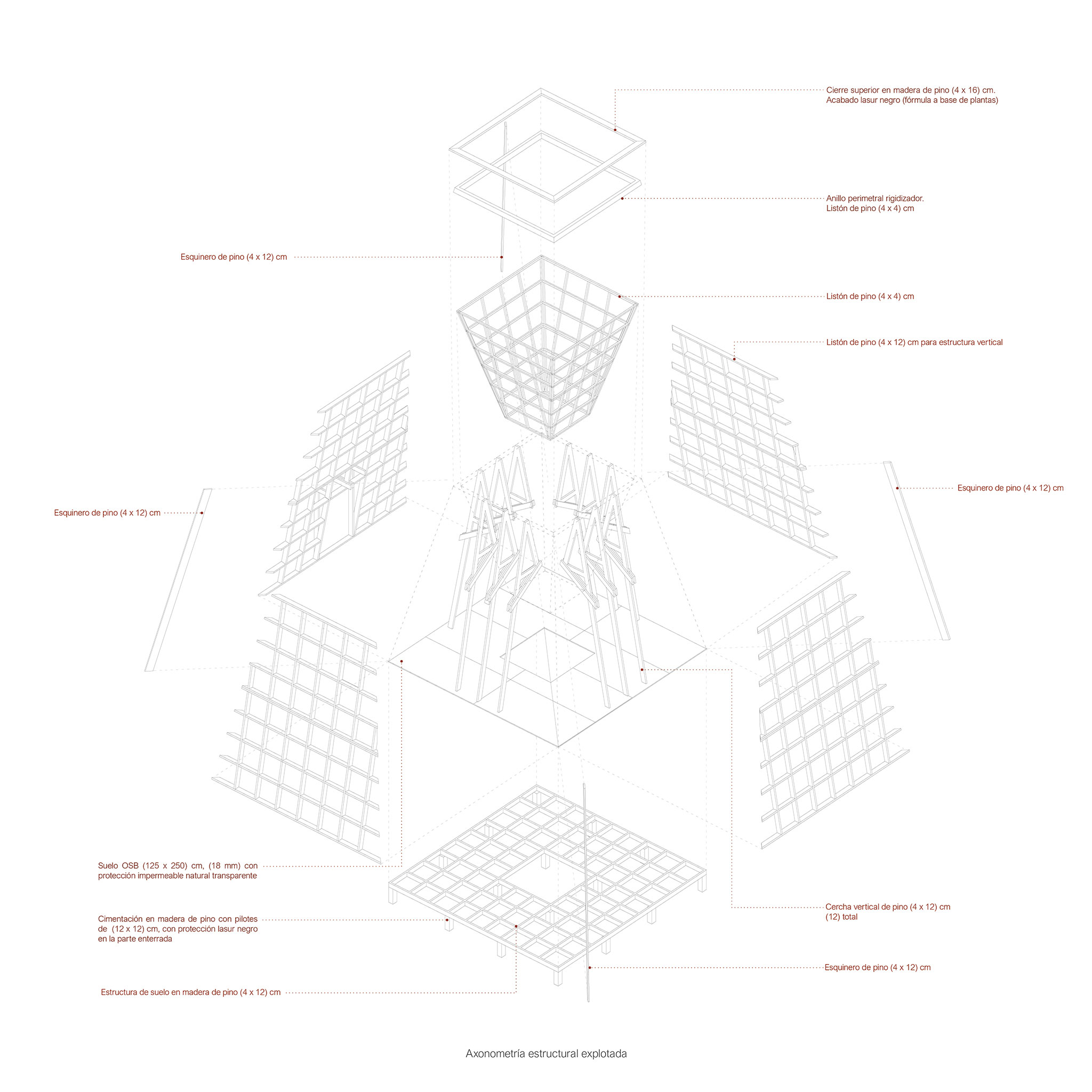 The proposal developed by P + S Estudio de Arquitectura, recently awarded the First Prize COAM 2025 in the Ephemeral Architecture category, is resolved through a geometric operation that articulates a central void from a virtual 5x5x5 meter cube. This "spatial artifact" for contemplation is conceived as a supporting structure activated by interaction with water.