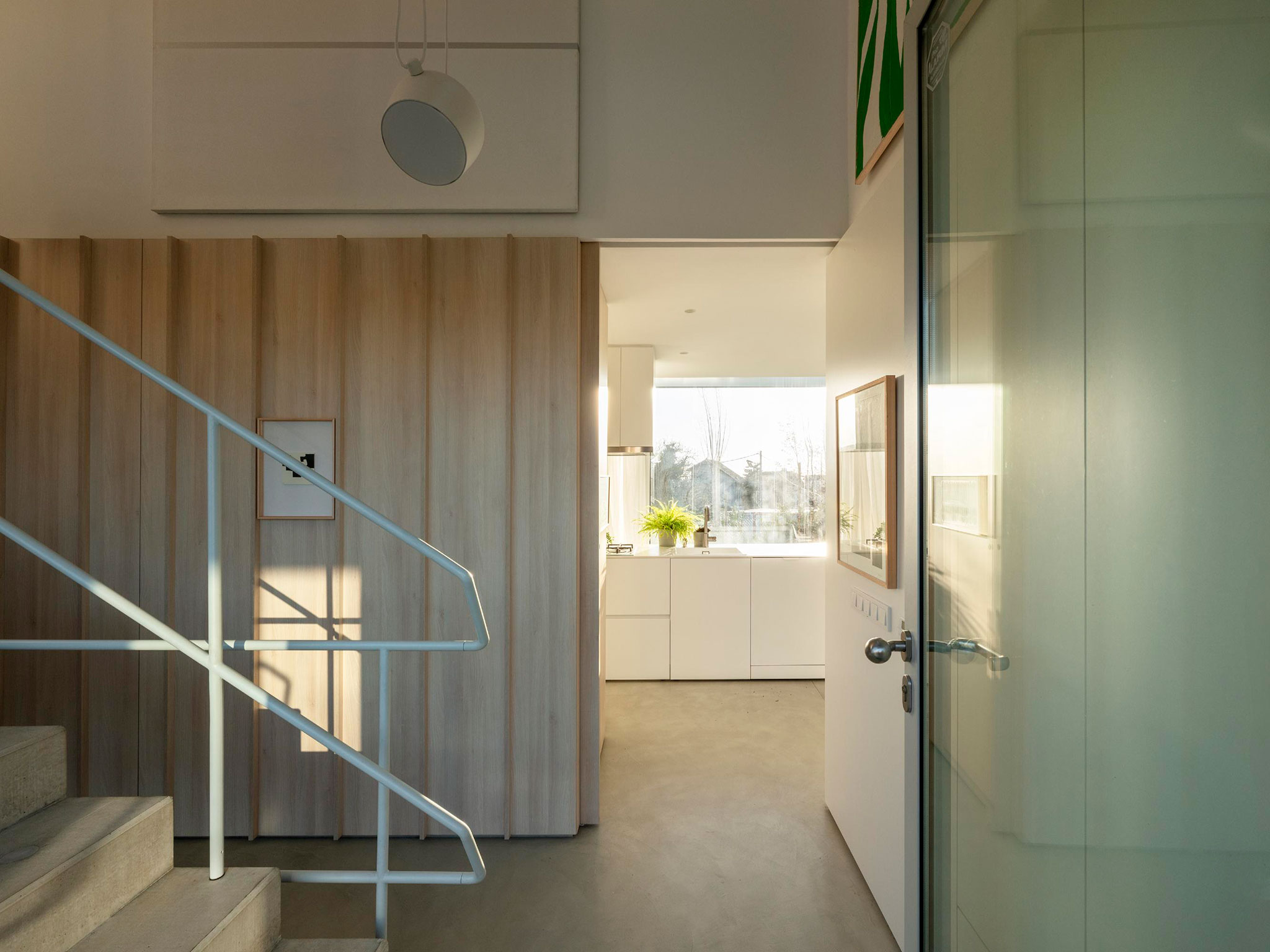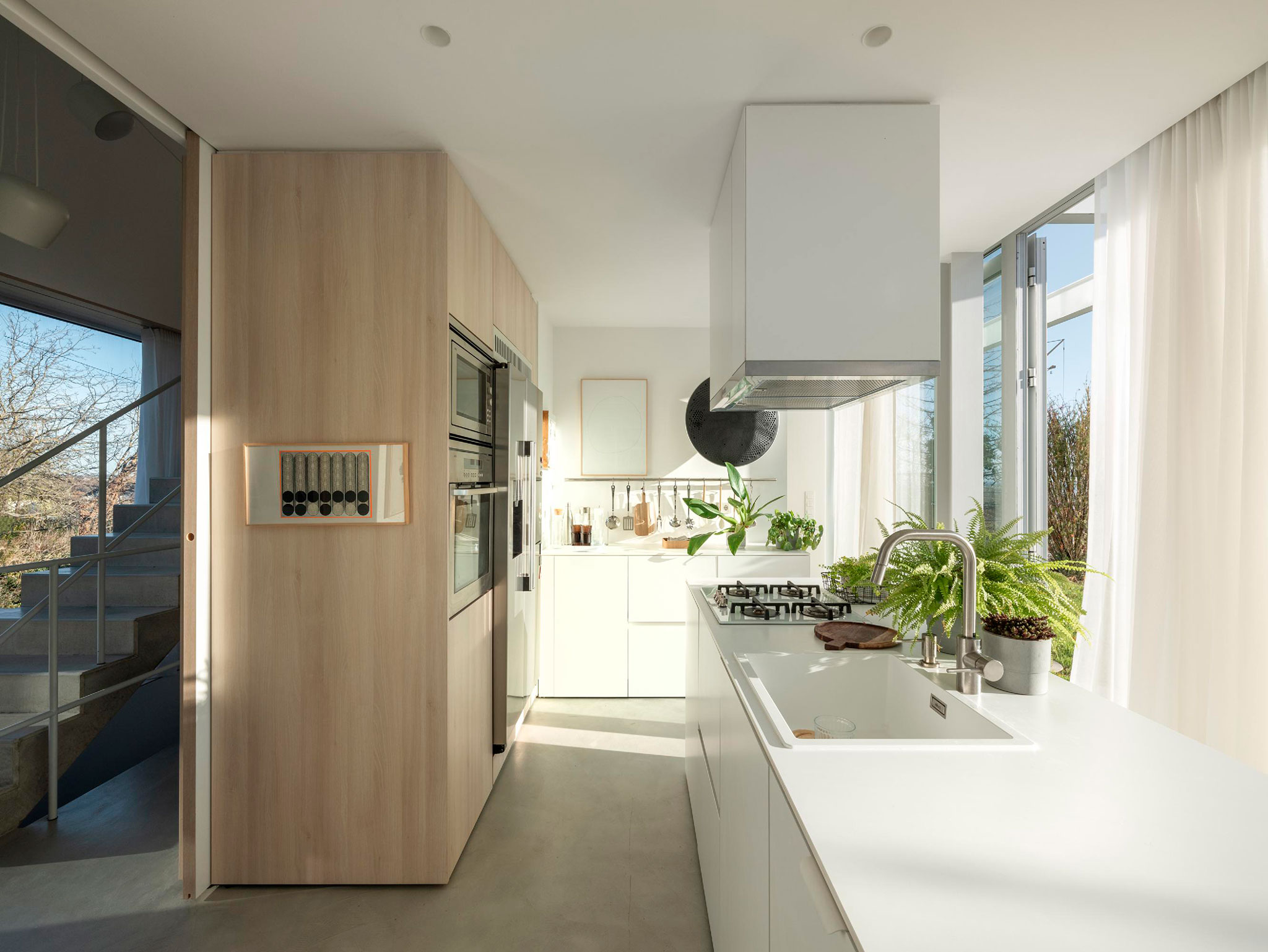 The natural slope of the land allows direct access from the street to the underground garage, designed as a flexible space for parking, events, and art exhibitions. Between the two dwellings, a double dividing wall houses gardening tools, a kitchen, and a barbecue area.