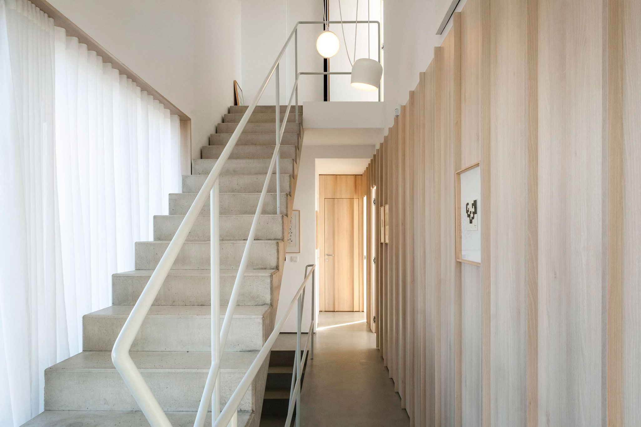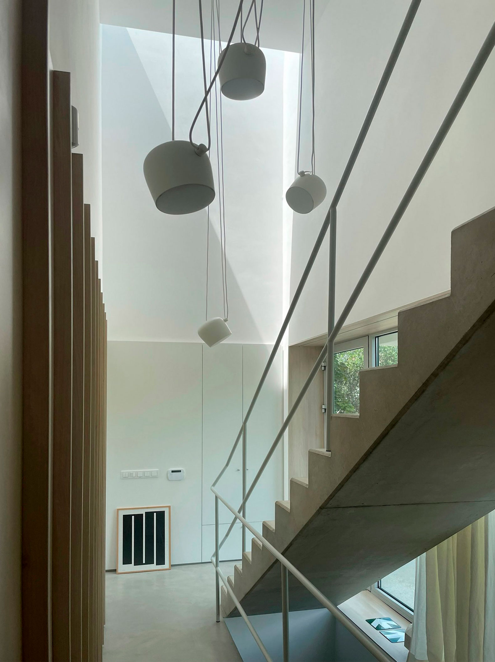 The natural slope of the site allows direct access from the street into the underground garage, while the ground floor opens seamlessly into the garden. The double wall of the atrium - positioned between the two home – functions not only as a spatial divider, but also as a practical niche housing garden tools, a summer kitchen and a barbecue area, making it a central element for family gatherings. The garage beneath the house is designed not only for parking but doubles as a party venue and an exhibition space for heavy-duty artworks displayed in lightboxes and on metal panels.