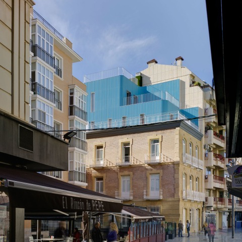 The contrast between the two levels of the project is further emphasized by the blue ceramic modular elements that make up the transversalized facade of the new apartments and that generate a continuous and recognizable image. In addition, the recesses with respect to the historic façade, beyond the one above the already built, are destined for terraces and pools that complement the apartments on the outside.