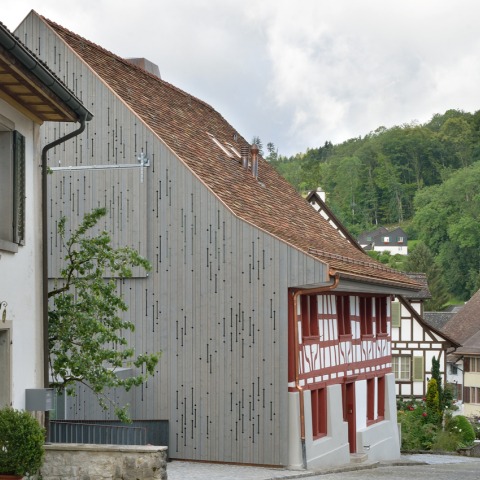 House Ledenmann, a two-storey half-timbered building located on the south slope of Unterberg is one of many historical jewels found in Regensberg. The poor state of the house, due to various structural damages and numerous improper repairs, a simple renovation of the house was no longer possible. In close cooperation with the municipality and the townscape protection committee, the final decision was to partially demolish and rebuild the house in its original volume. Two frontal half-timbered facades and a vaulted cellar have been preserved due to their presence on the preservation list. Finally three sculptural, modern multi-family houses were constructed behind the historical face of the building.