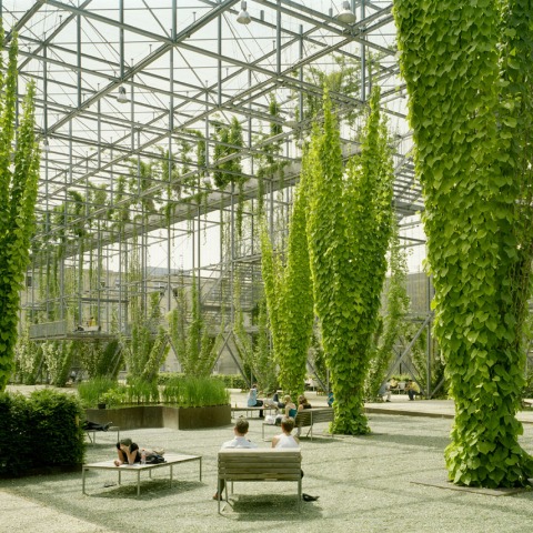 The residential and service buildings in the centre of northern Zurich are enhanced by the numerous possible uses of the plaza and "park house". The facility is suitable for sports and games, meetings of all kinds, or events such as film screenings, concerts and theatrical performances – all with a baroque backdrop of hedges. The MFO Park, measuring 100 meters long, 34 meters wide and 18 meters high, is the largest pergola in the world.