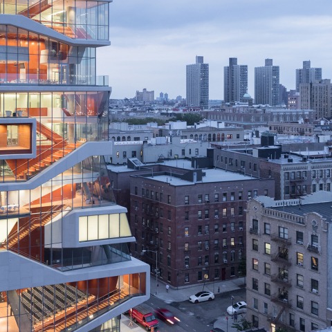 DS+R’s design takes advantage of an incredible view of the Hudson River and the Palisades. The building also integrates a range of sustainable features—including locally sourced materials, green roof technologies, and an innovative mechanical system that minimizes energy and water use—and the façade features ceramic “frit” patterns that are baked onto the exterior glass to diffuse sunlight. All new construction and renovation projects—including the Vagelos Education Center—work toward the goal of minimizing CUMC’s carbon footprint and reducing greenhouse gas emissions by 30 percent by 2025.