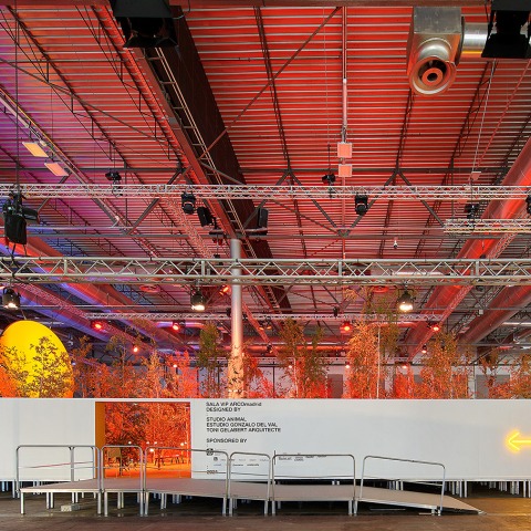The proposal utilises only elements related to the exhibiting and fair context: floorboard, chipboard walls and carpet. The pavilion repeats the constructive logic of the rest of the stands in the fair, willing to integrate itself as a new element within ARCO. The floorboard rises 60cm above ground level, generating a space enclosed by a continuous perimeter of 2,40 meters high. This elevated platform will help differentiate the VIP room from the other galleries. Besides, the prefabricated system of the floorboard provides an adaptable and flexible solution, giving order to the beaconing grid. The interior of the pavilion results in a huge abstract vase of 1000m2 carpeted in yellow.
